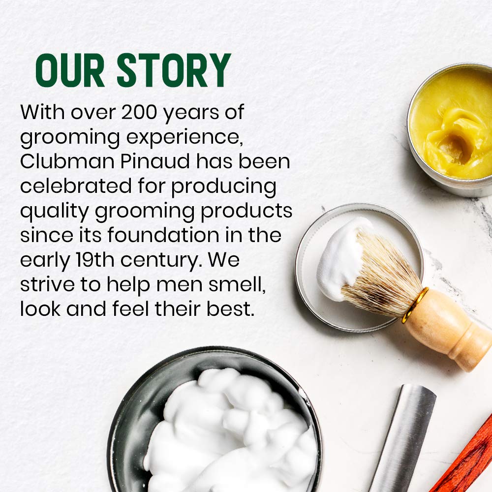 • CRUELTY-FREE, MADE IN THE US, TRUSTED FOR GENERATIONS: With over 200 years of grooming experience, Clubman Pinaud is a trusted brand. Clubman has been celebrated for producing quality products since its foundation in the early 1800s. Men have been using their products for generations, while younger users are turning to their products for trusted grooming solutions with a sense of nostalgia, proving quality never goes out of style. Completely cruelty-free, proudly made in the USA.