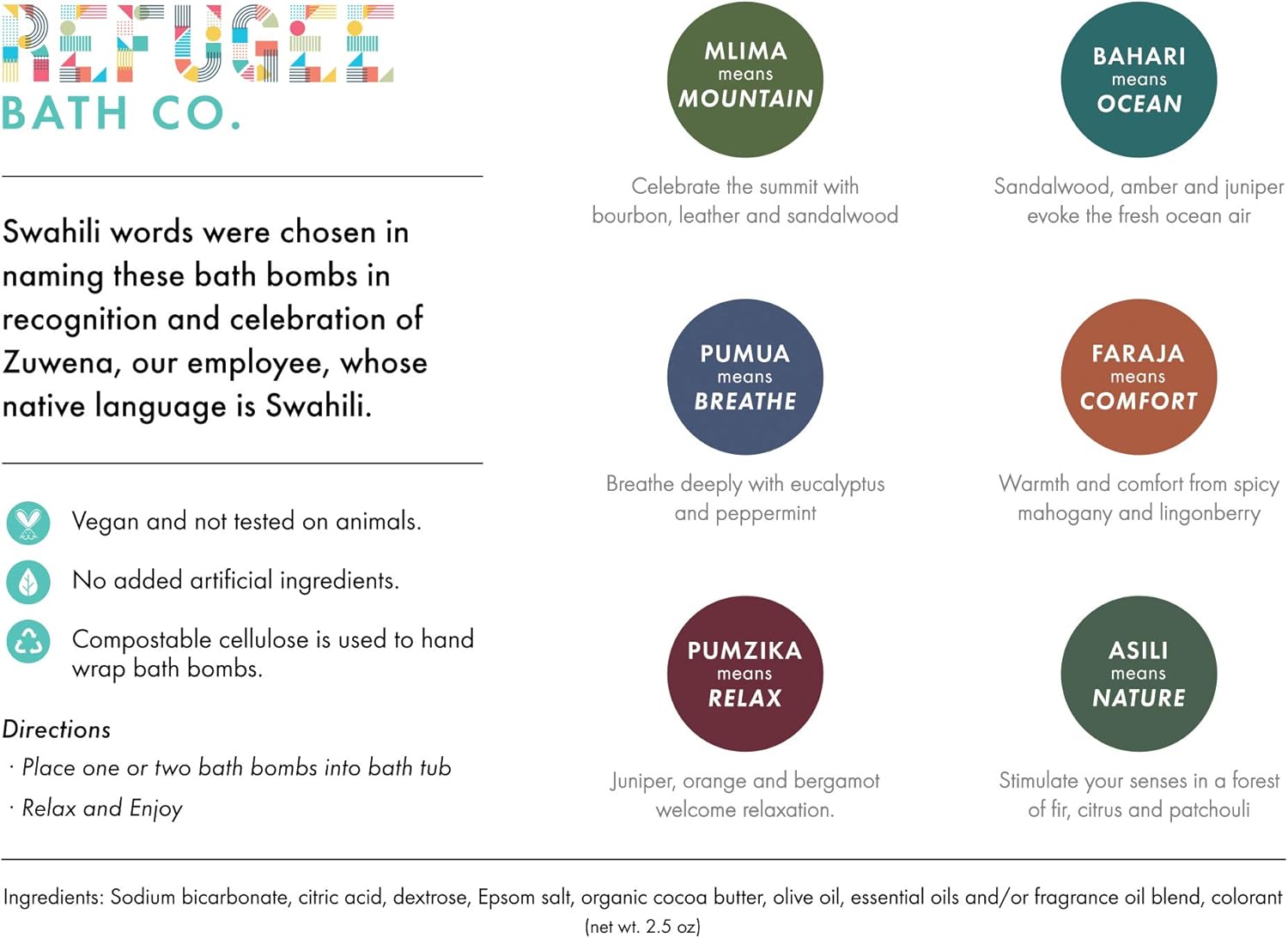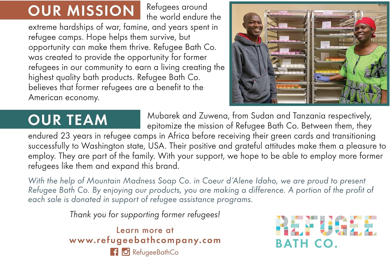 • Refugee Made! Every box contains a "thank you card" explaining more about the individual who made your bath bombs. Each bath bomb is proudly hand-made in Washington State by refugees in our community. Our primary mission is to celebrate and welcome refugees in our community by providing employment.