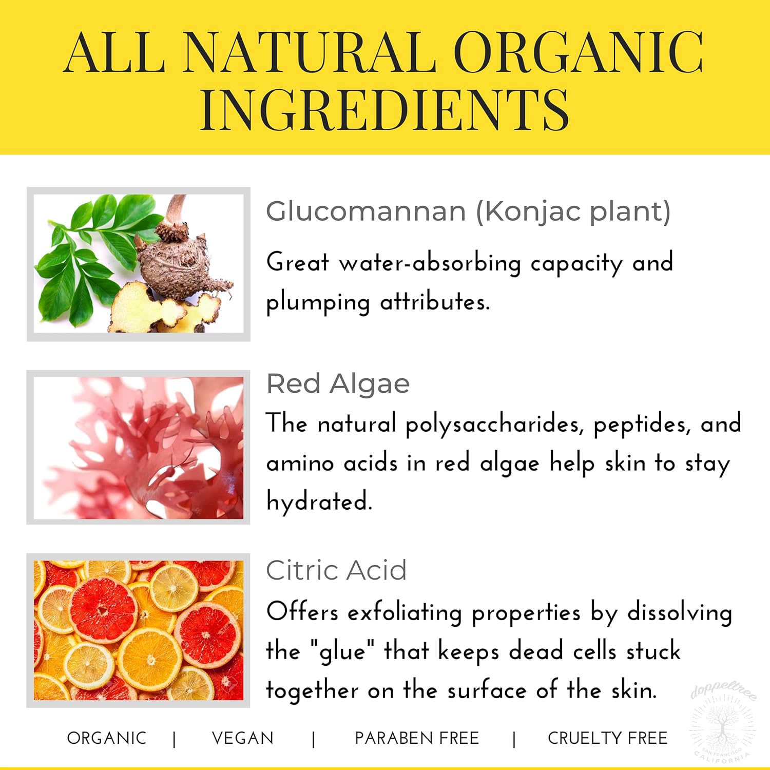 • 🌿 All Natural, Dermatologist Tested: Based in San Francisco, at Doppeltree we’re all about all natural organic ingredients, cruelty free processes, and sustainability. Look your best and feel good about it at the same time.
