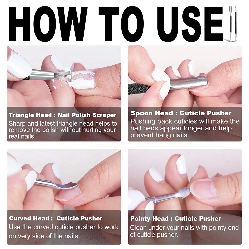 • FOUR WELL-DESIGNED HEADS: The spoon head is curved ergonomically with thicker slope, which avoids causing injury when pushing the cuticle. The triangular tip is made with thin and sharp edge, which can remove the gel polish cuticle easily and thoroughly with less scraping on nail bed. The curved-blade head is a good helper to clean up the residue along the cuticle line. The pointy head helps to remove the dead skin under your nails