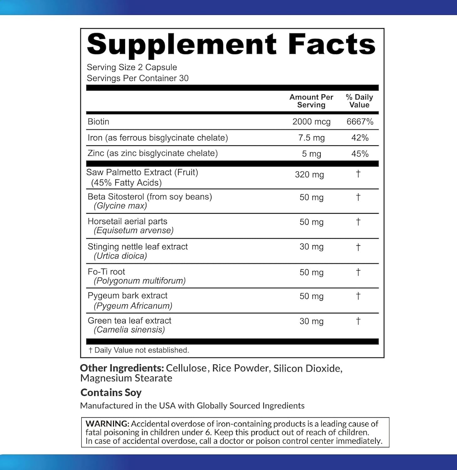 • Healthy Hair Growth Support - Our Premium Hair Support Supplement contains key ingredients (iron, biotin, zinc, saw palmetto) and other ingredients to support your healthy hair. Great support for hair types of all kinds - For both Men and Women One Month Supply