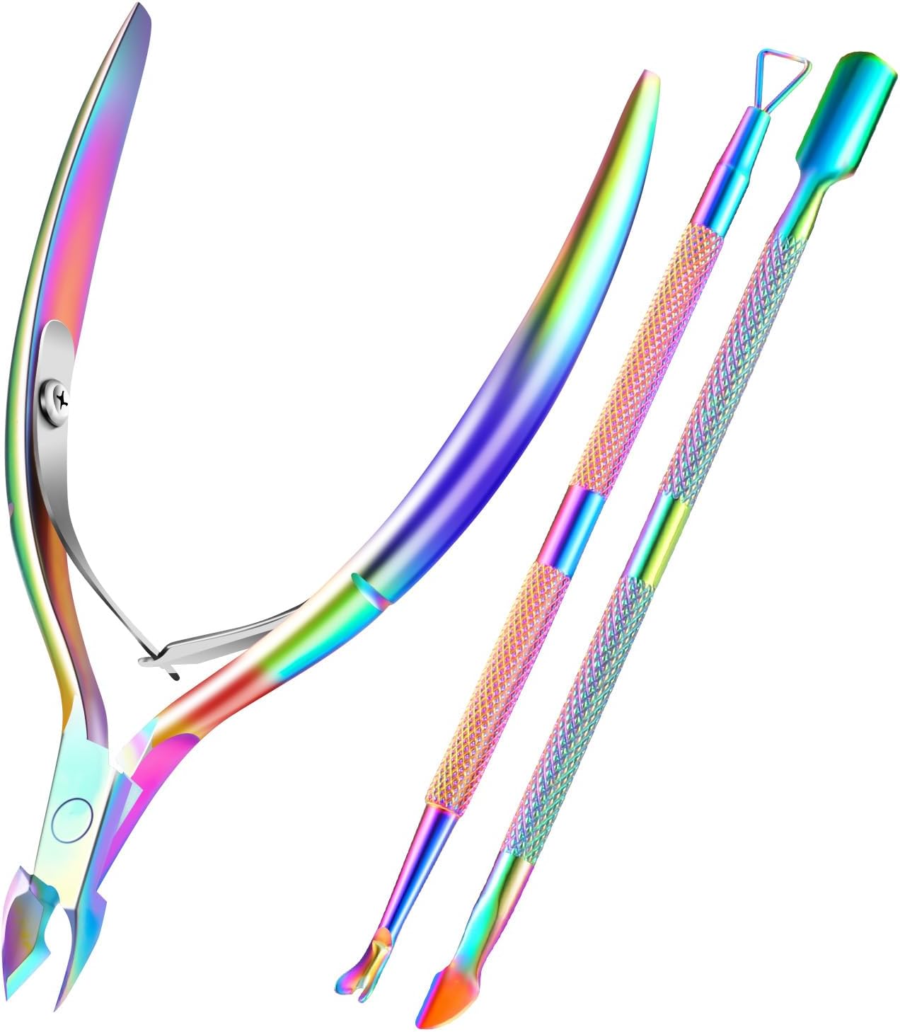 • 5 in 1 Manicure and Pedicure Tool Set -- Including cuticle trimmer, cuticle pusher cutter flat head, cuticle pusher cutter sharp head, dead skin fork and triangle nail polish scraper. Use the flat head to gently push back the cuticles on your nails; Use the trimmer to neaten cuticles. Use the triangle head to peel or remove gel nail polish; Use the cuticle pusher cutter sharp head push down the cuticles at the corners of your nails. They are great beauty tools for manicure and pedicure.
