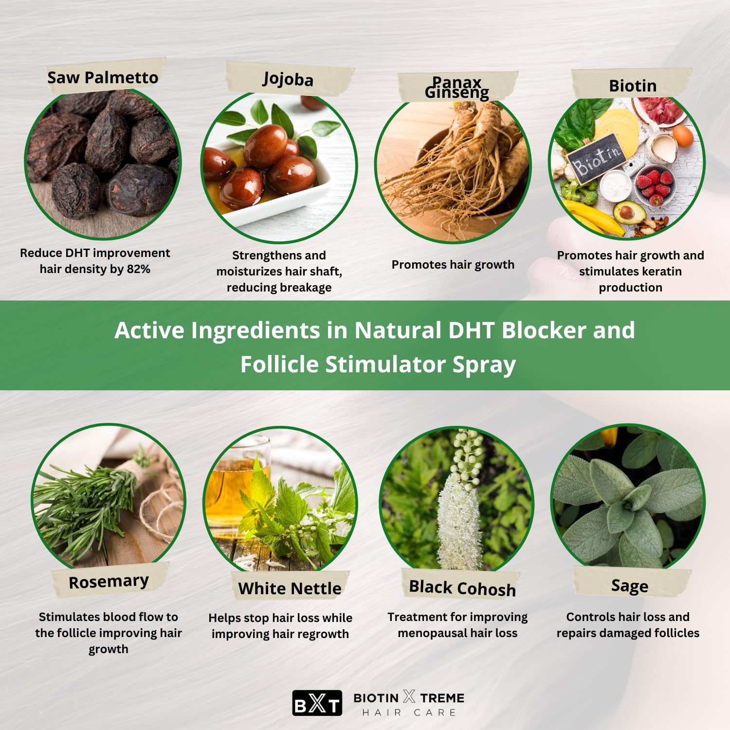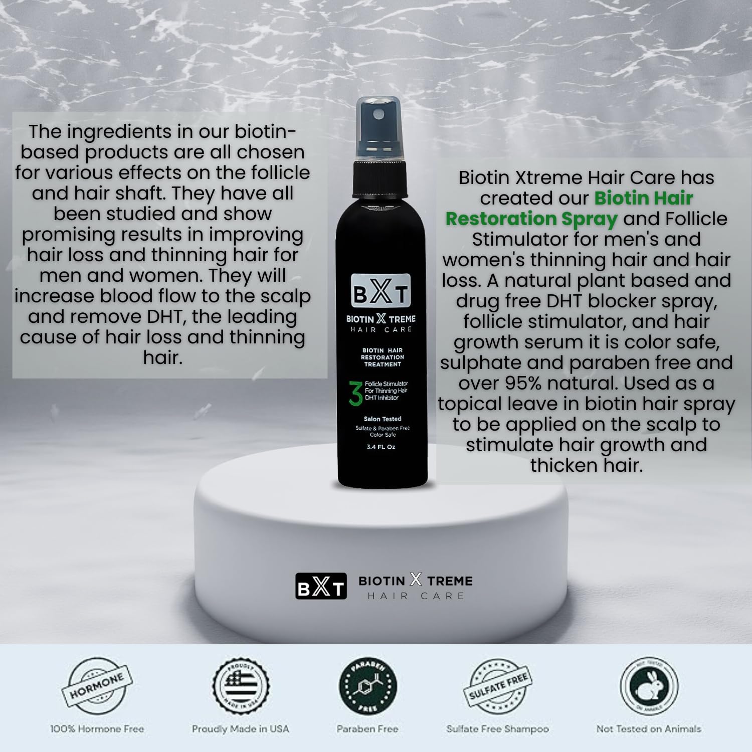 • Natural DHT Blocker: Our Biotin Hair Restoration Spray for men and women is a drug-free solution designed to naturally block DHT, a key contributor to hair thinning and loss, using effective and natural ingredients.