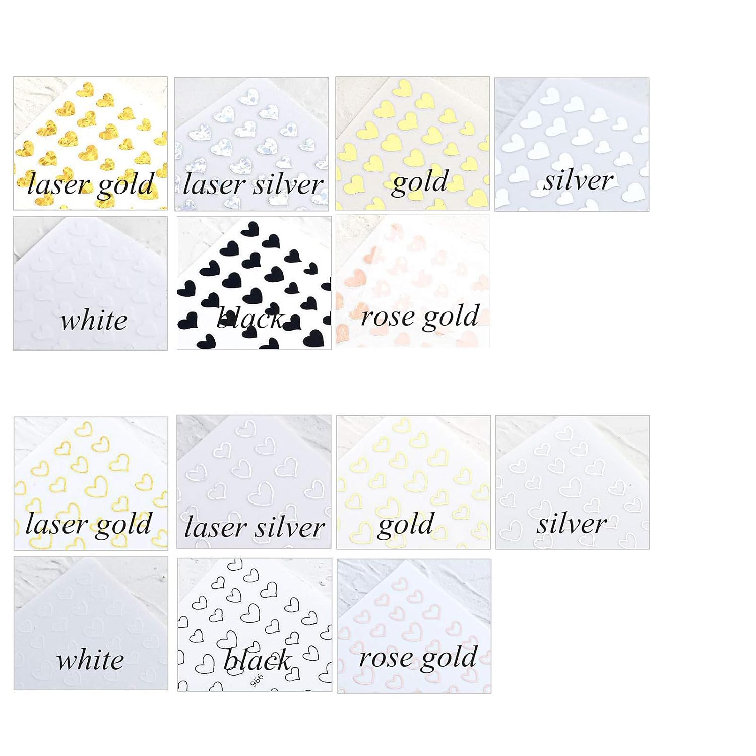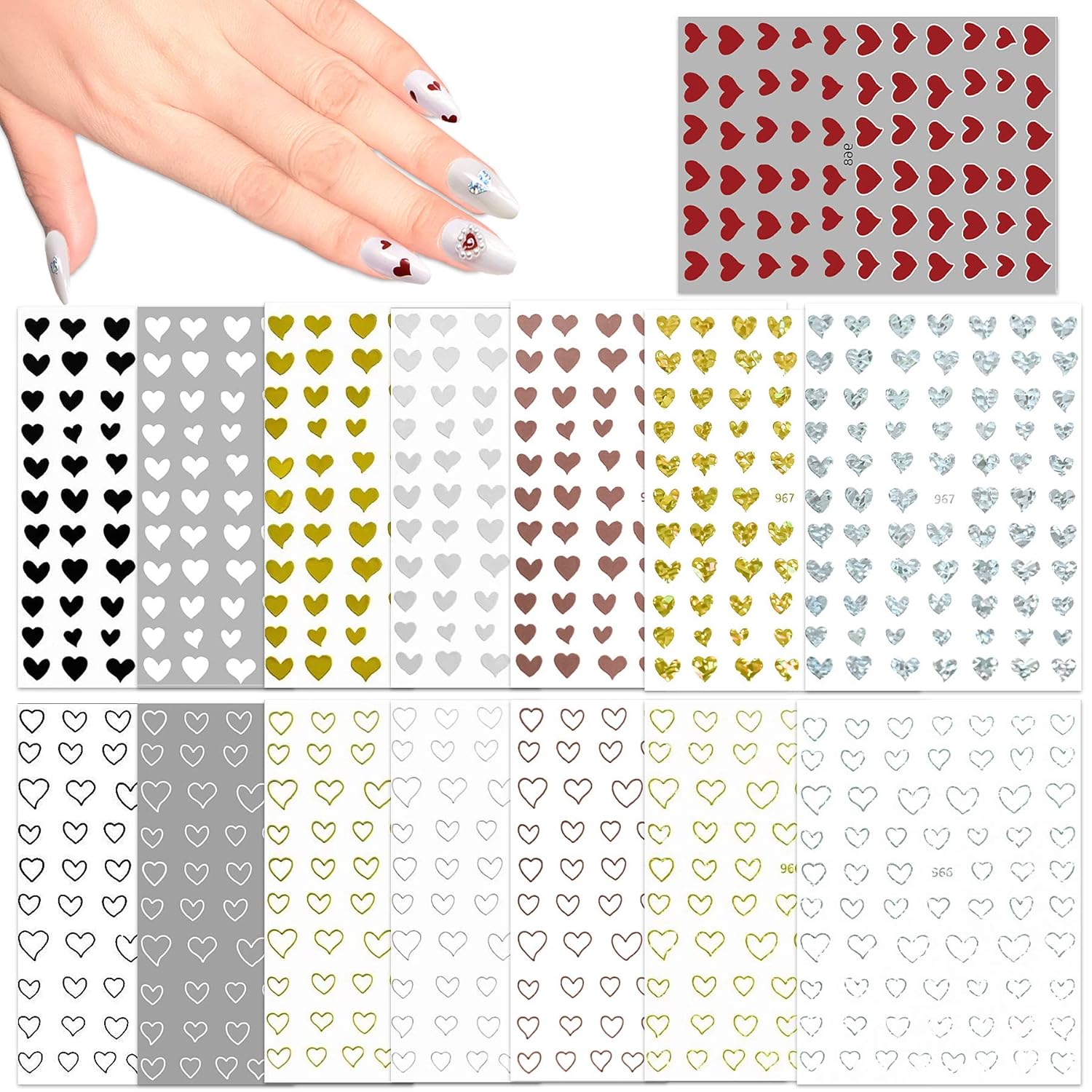 • There are two kinds of heart designs - solid heart shape and hallow out heart shape. Each design has 7 different colors - black, white, gold, silver, rose gold, laser gold and laser silver. Besides, there is also a sheet of red heart nail stickers.