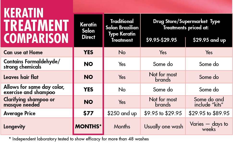 • DELIVERS SALON QUALITY RESULTS AT HOME, SAFELY and EFFECTIVELY: Keratin Salon Direct provides comparable results to traditional salon Brazilian-type keratin smoothing treatments when it comes to removing frizz and smoothing hair – but without the harmful chemicals. And, because KSD works from the inside out to strengthen and fortify hair, results with KSD mean hair is not only smoother, but also healthier looking and more manageable.
