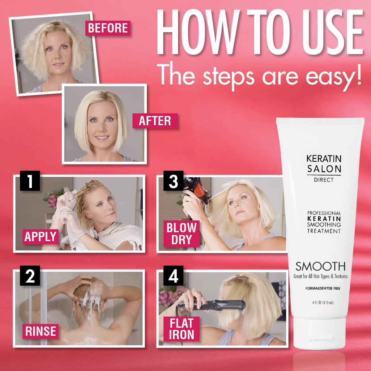 • CONVENIENT AND SAFE FOR YOU TO USE AT HOME: (1) Apply it to your clean damp hair (2) Leave it on your hair for the recommended amount of time (3) Blow dry your hair and then flat iron until silky. That’s it! Style any way you want! Your hair will look like you just left the salon, and the gorgeous look and feel will last for months. Your hair can be curled or dried with a round brush for volume - the fabulous look only professional treatment can deliver!