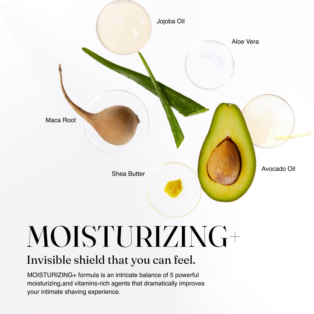 • MOISTURIZING+ FORMULA - Formulated with 5 powerful moisturizing, and vitamins-rich agents that dramatically improves your intimate shaving experience; Jojoba Oil / Avocado Oil / Aloe Vera / Shea Butter / Maca Root.