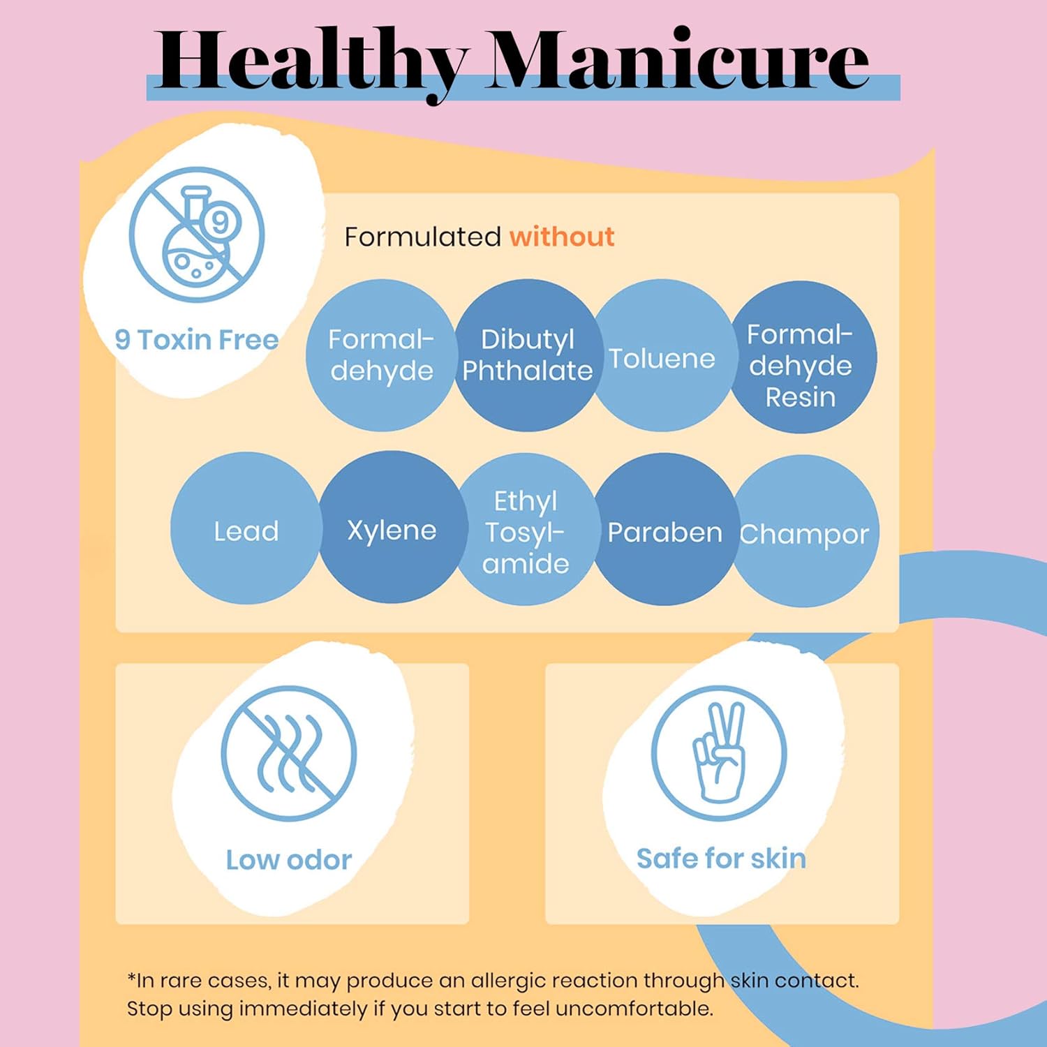 • 【Environmental & Healthy】: 9 Toxin Free Ingredient makes it healthy and low odor. No harsh ingredients or adhesives that lead to damaged nails.