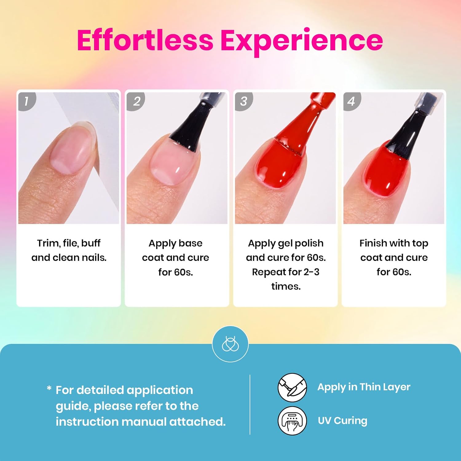 • UV/LED Soak Off Gel Polish: Works with all UV and LED nail lamps. Simply cure each coat for 60–90 seconds for a long-lasting, glossy finish.