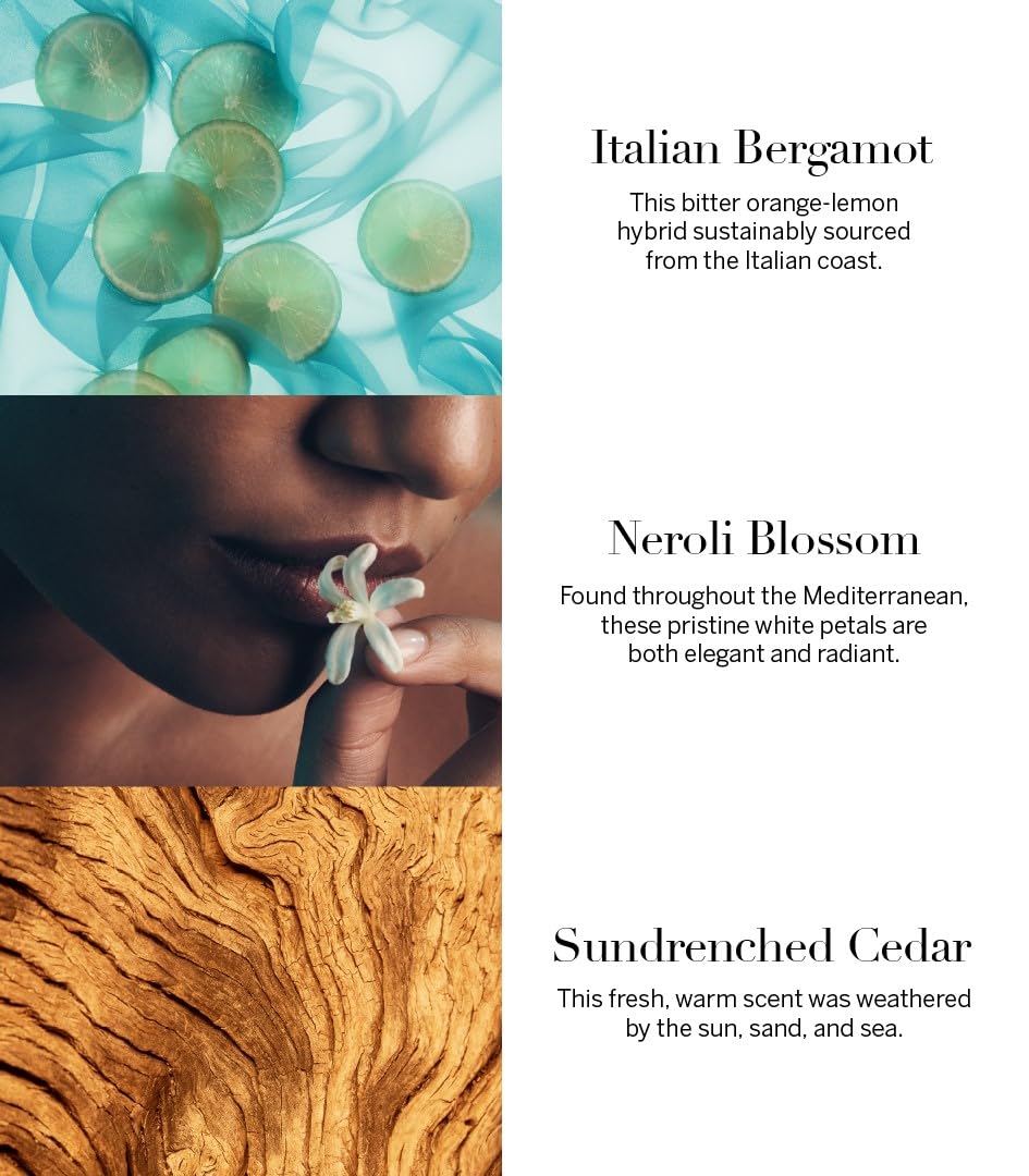 • Scent notes of italian bergamot, neroli blossom, and sundrenched cedar.