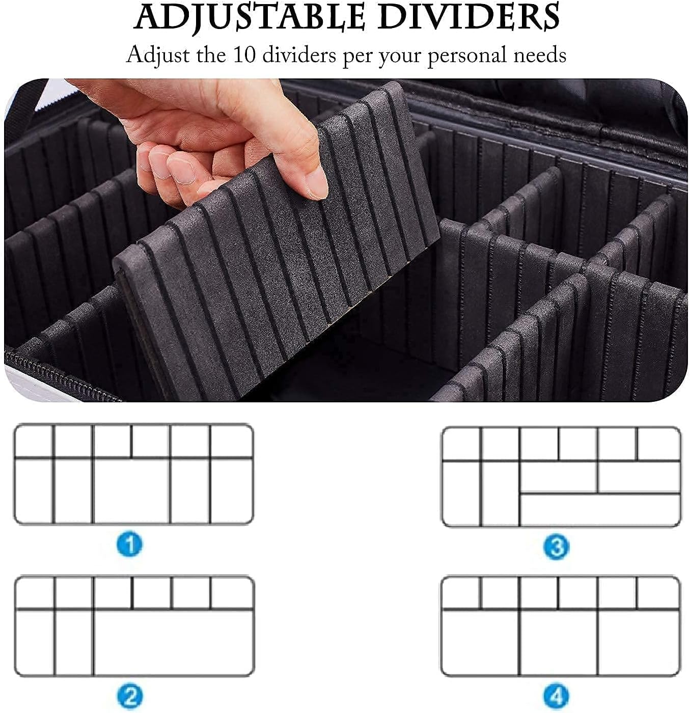 • Adjustable Compartments: This makeup bag has 10 adjustable EVA dividers and 12 makeup brushes slots. You can design the internal compartments by adjusting the dividers to fit different cosmetics and keep them perfectly separated and organized.
