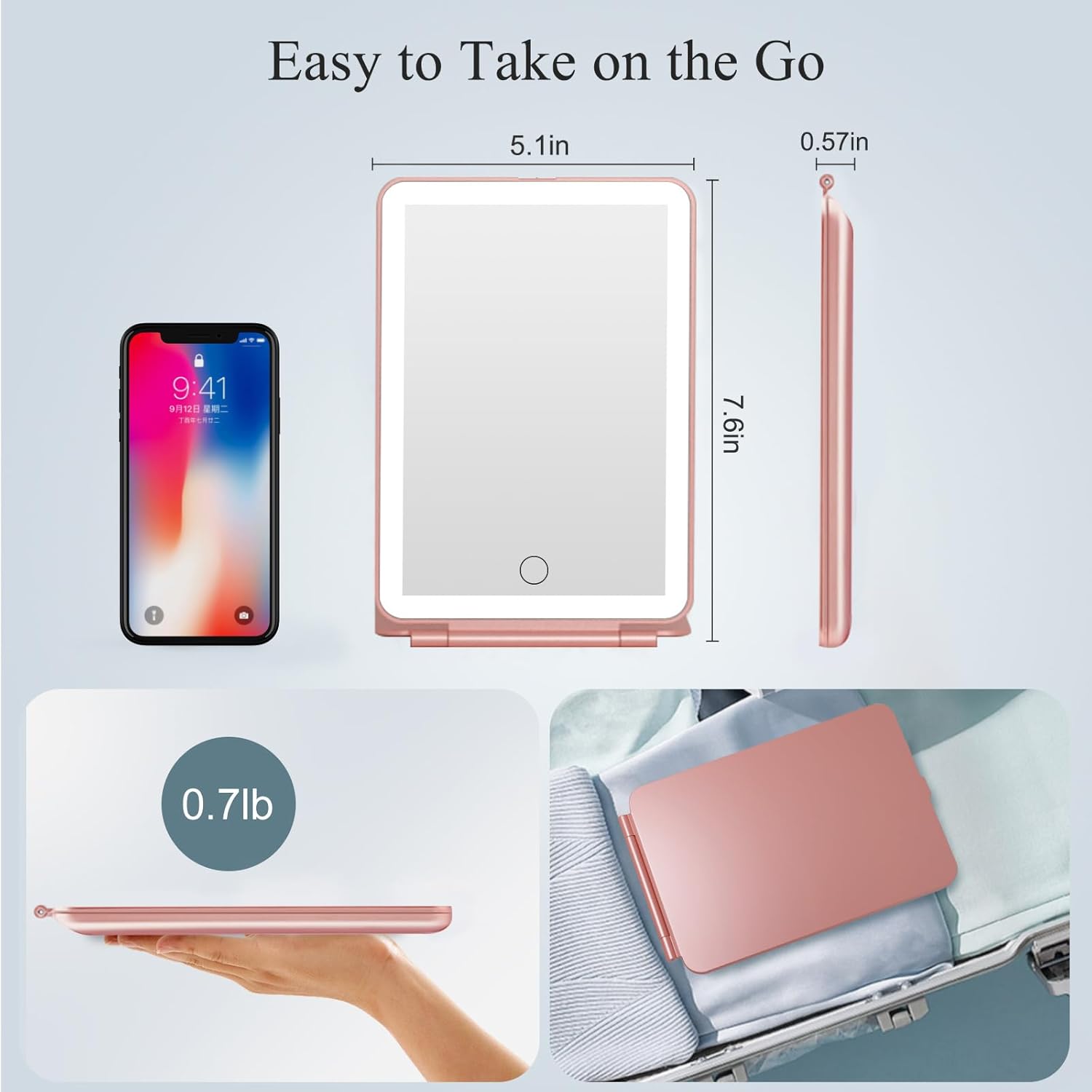 • 3.【Travel Size Lighted Makeup Mirror】 This rechargeable travel mirror with lights is Ipad Mini Size.The slim, lightweight and compact design makes the Eclipse your new travel buddy. Whether you’re in a hotel, train, university or at home this mirror makes it easy for slipping into your overnight bag ready to take on whatever the new day brings.