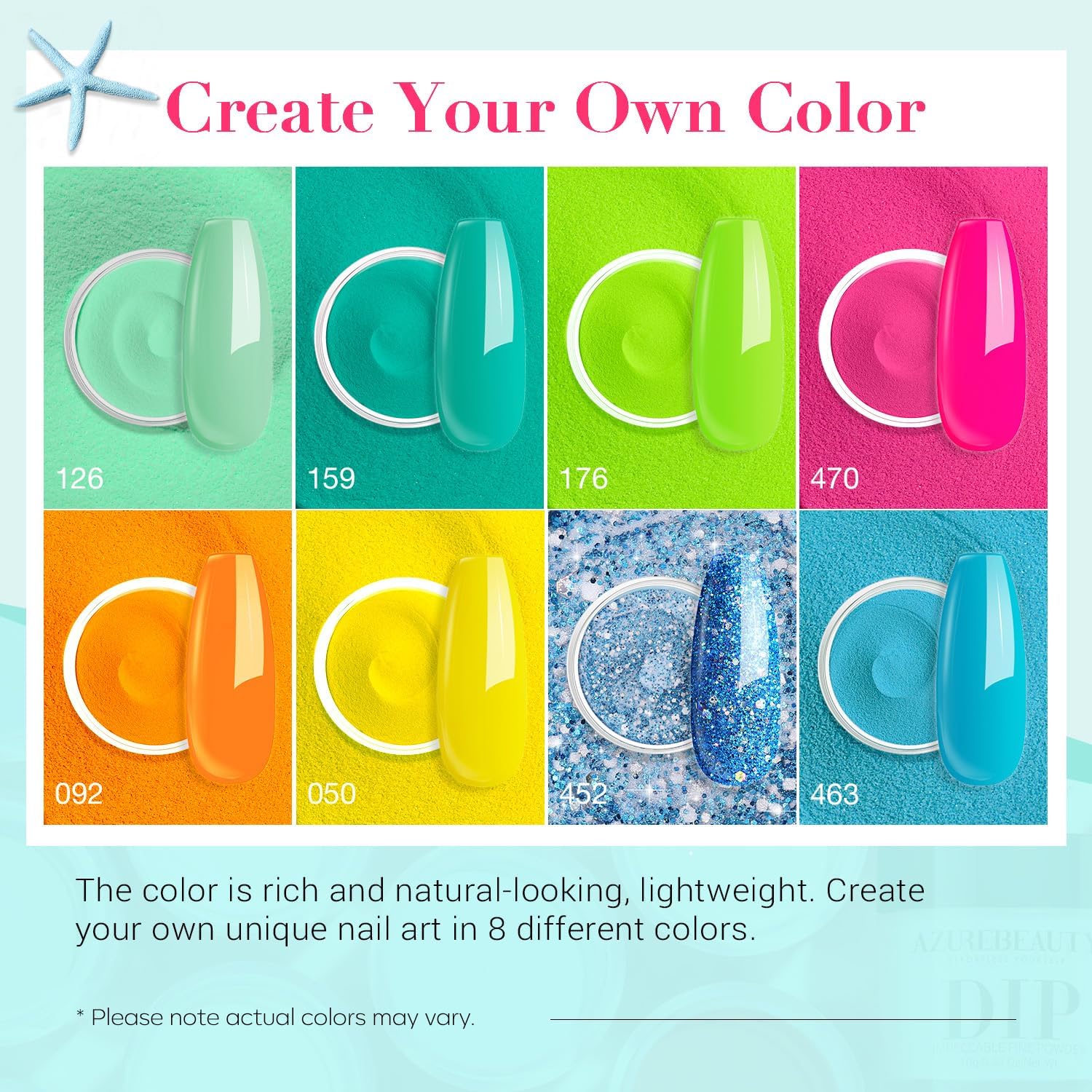 • 🧜‍【30 Pcs Upgraded Mermaid Starter Kit】AZUREBEAUTY 30 Pcs pastel & neon dip nails powder starter kit: 8*10g (0.35oz) color powder, 4*10ml dip powder liquid set(base coat/activator/top coat/matte top coat), 2*liquid brush replacement, 1*nail brush,1*nail file, 1*nail buffer, 1*dip powder recycling tray. 💅What's more, 10*nail sticks and 2*orangewood stickers are added in the kit for color testing as well as ease of use.💅