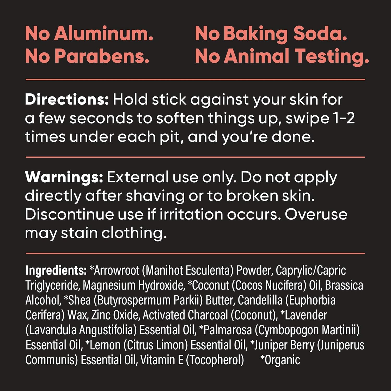 • EFFECTIVE ODOR CONTROL - Specially made for those with sensitive skin, our baking soda-free deodorant uses activated charcoal, zinc and magnesium to fight odor naturally. Organic arrowroot powder absorbs moisture so you stay dry and fresh. Get powerful all-day odor protection without aluminum.