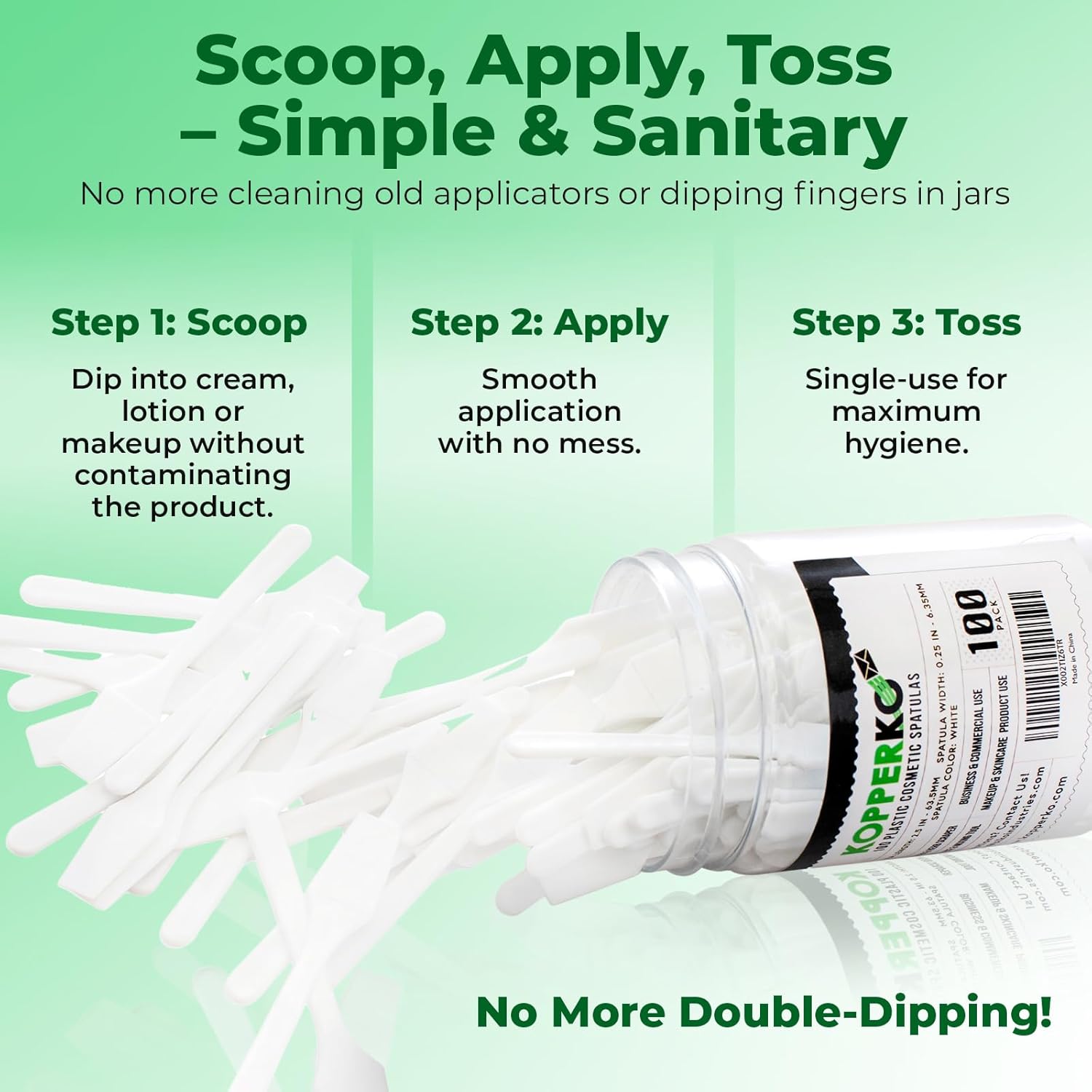 • Clean Out Your Containers: Maximize product use with our 100 pack of 0.25"x2.5" disposable fingertip spatulas. Easily extract creams, lotions, or makeup from containers, even in tight spaces, without getting product under your nails