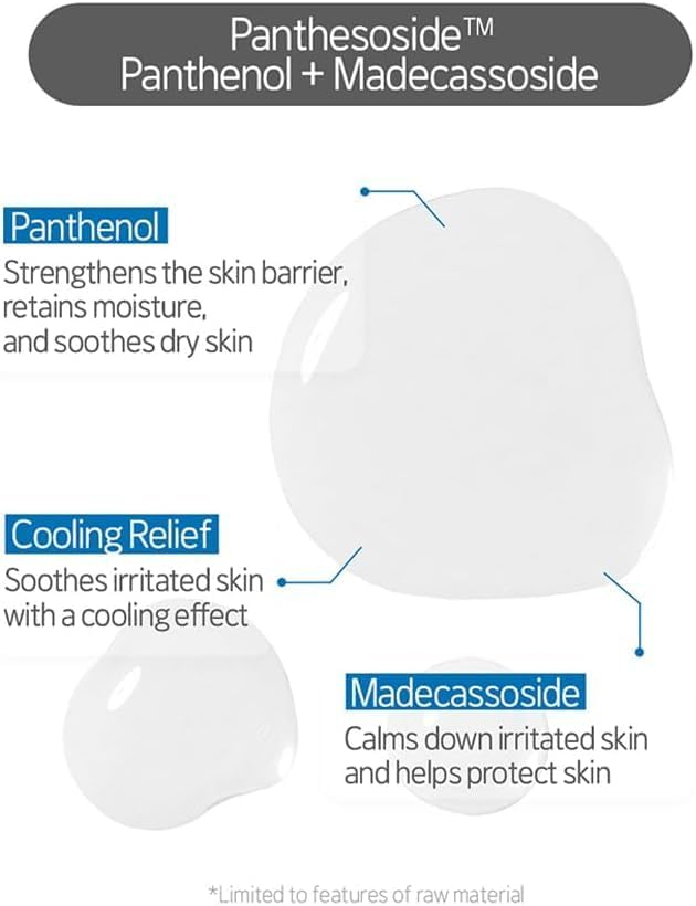 • Panthensoside Contained to Calm Skin: Panthenol(Strengthens skin barrier and soothes dry skin) + Madecassoside(Soothes irritated skin and protects skin from external stimuli)