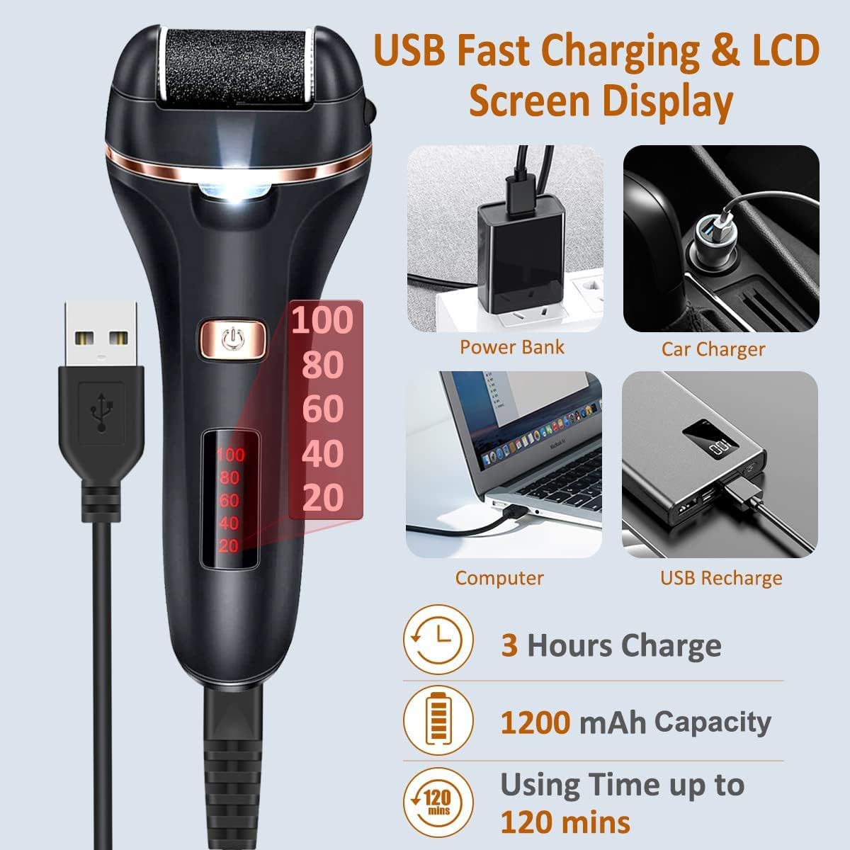 • 【 LED Remaining Power Display】 Rechargeable foot callus removers charging time for 2-3 hours, it can powerfully run continuously for about 120 Minutes. USB Charging Cable can be charged easily with power bank, car charger, computer, etc. You can easily see remaining power and when to charge