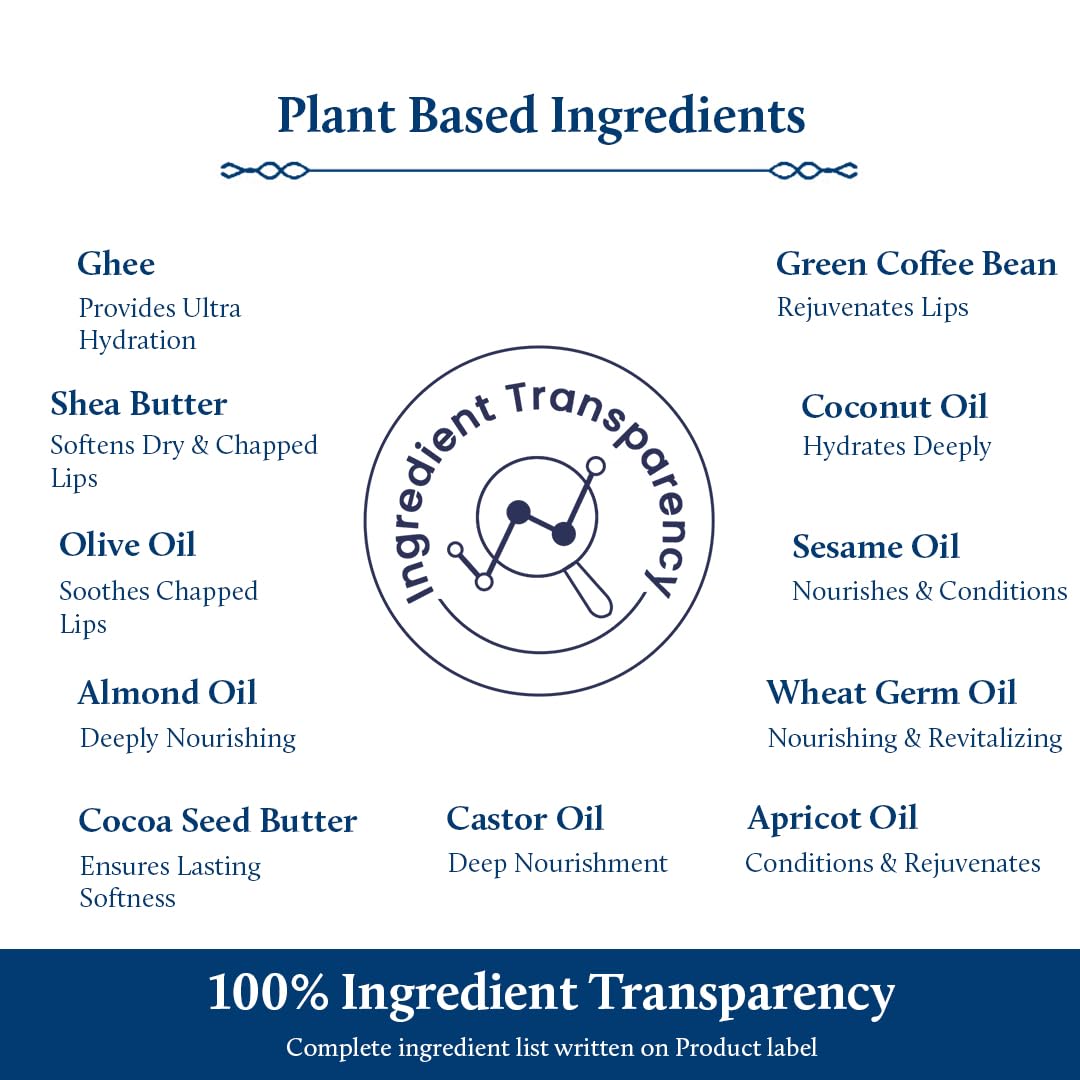 • DEEP HYDRATION for CHAPPED LIPS: Skin of the lip is thinner than the facial skin and tends to lose moisture quickly. The lip balm with Ghee and other natural oils like Coconut, Sesame, Castor and Almond Oil not only provide moisturization but also helps to seal and retain it. This fights dryness, chapped lips and gives Lip a healthy, supply, gloss and pout ready appearance