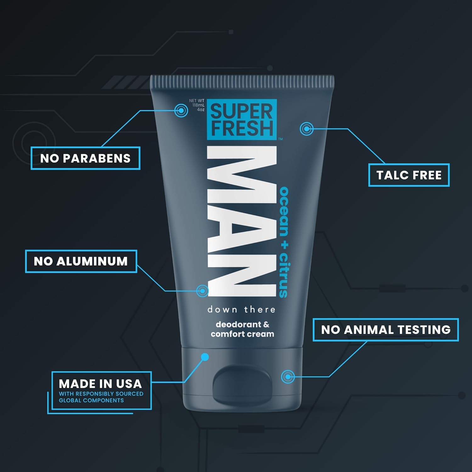 • FRESHNESS WHERE IT COUNTS EVERY DAY: Designed specifically for male hygiene needs, this lotion targets problem areas like the groin, inner thighs, backside, and even feet. Whether you’re suiting up for work, gearing up for sports, or heading outdoors, Super Fresh Man Parts provides reliable freshness and dryness. Proudly formulated, filled, and sealed in the USA to ensure premium quality in every tube.