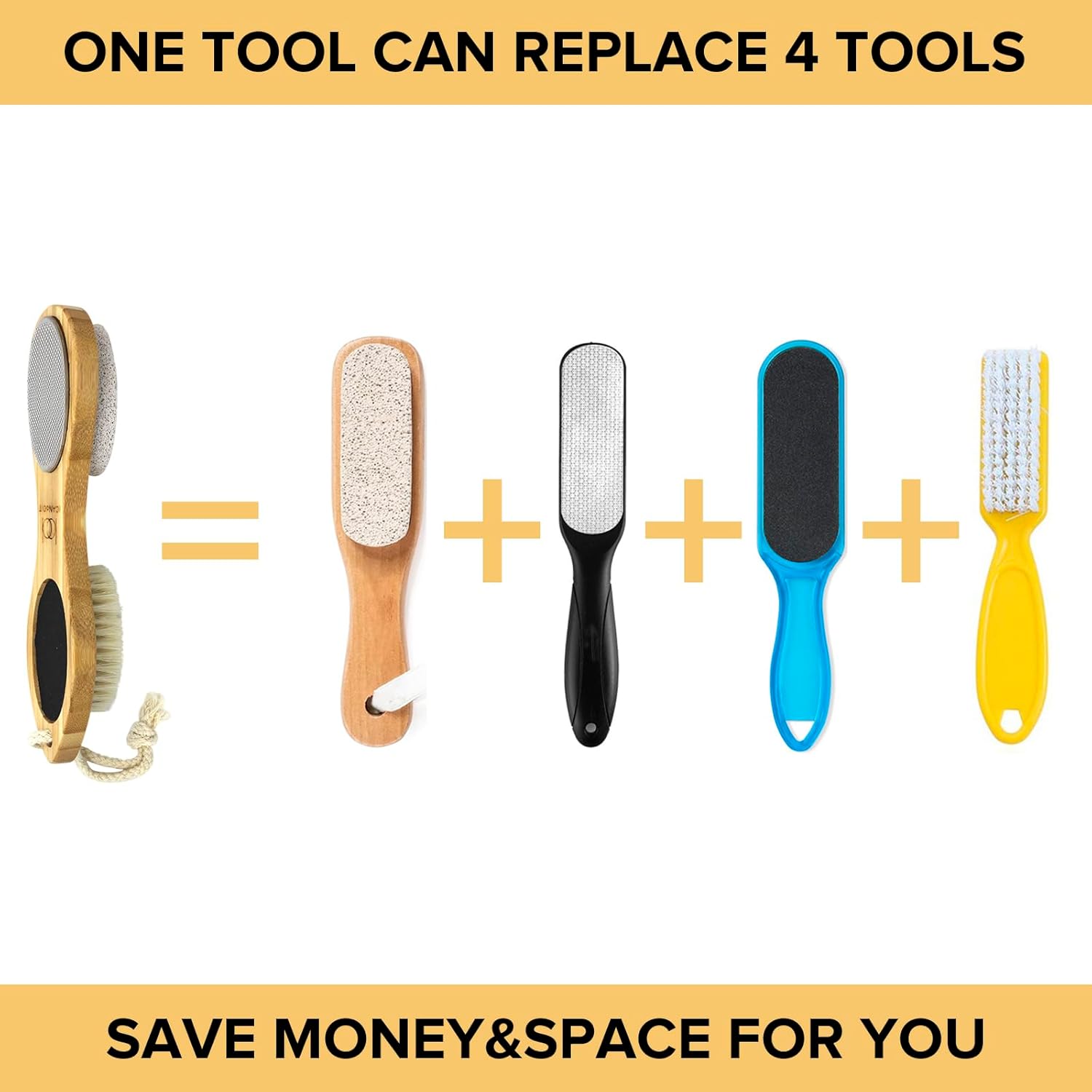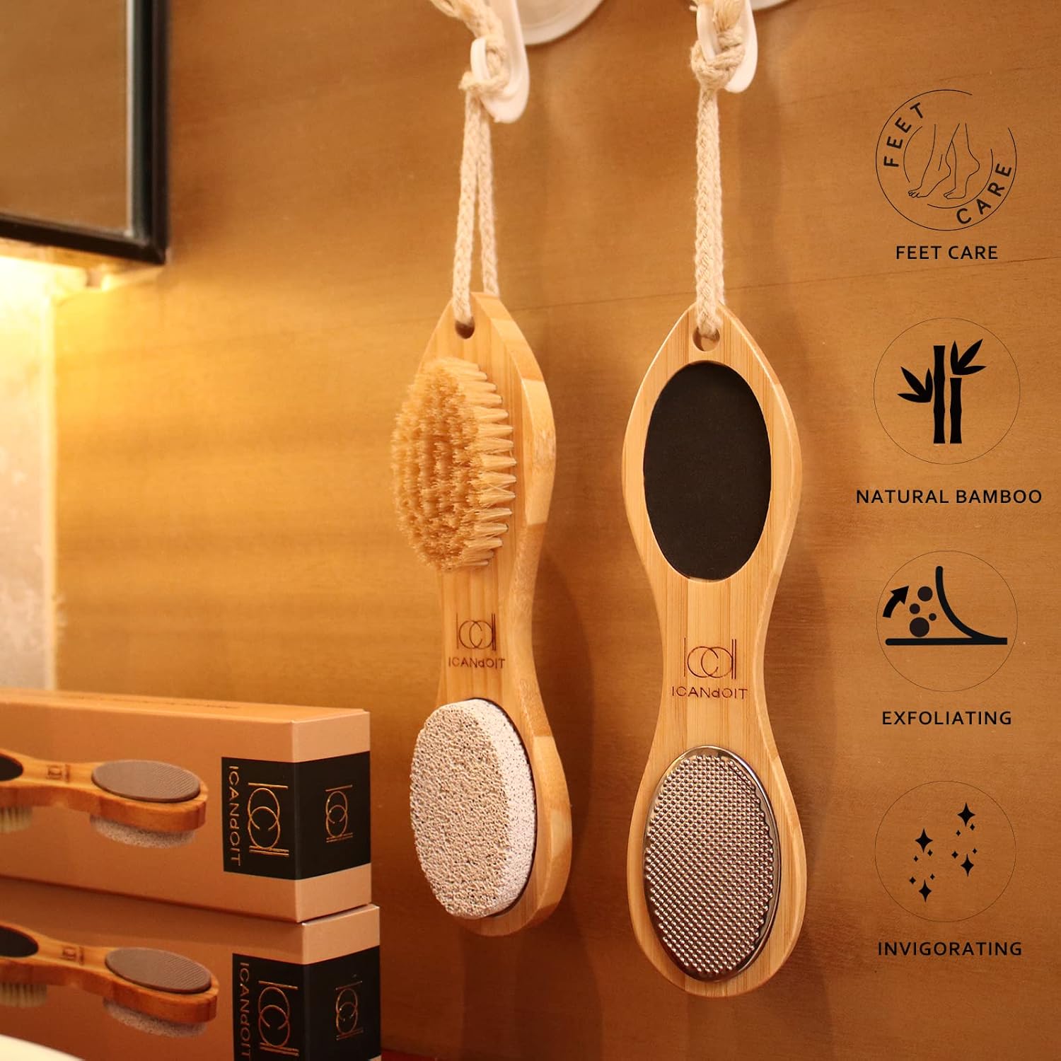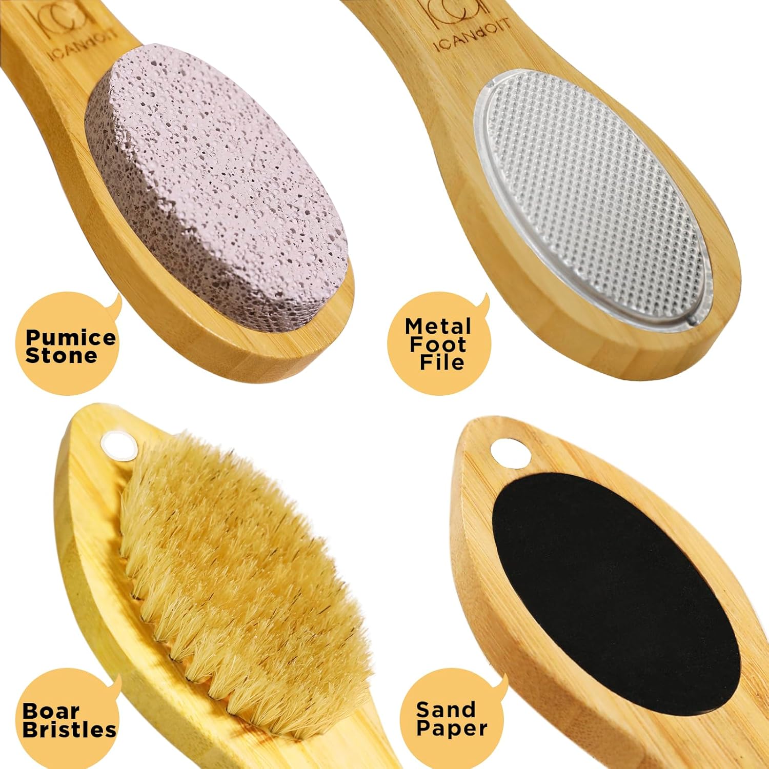 ICDI ICANdOIT Natural Bamboo Foot File Callus Remover-Multi Purpose 4 in 1 Feet Pedicure Kit with Foot Care Boar Bristle Brush,Pumice Stone,Foot Rasp,Sand Paper