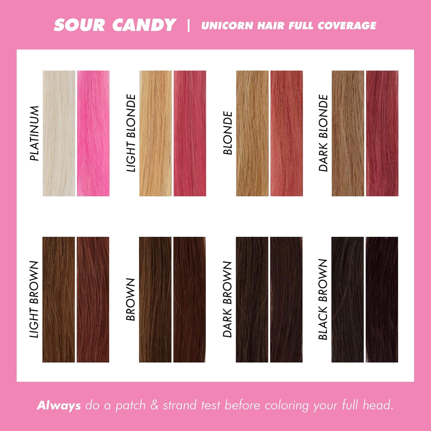 • Before You Use It: Unicorn Hair deposits super-saturated, vibrant color to pre-lightened platinum to medium blonde hair and adds a tint of color to dark blonde and light brown hair. The life cycle of the color depends on the shade and condition of your hair and how often you wash it. Always do a patch and strand test before coloring your full head because results may vary.