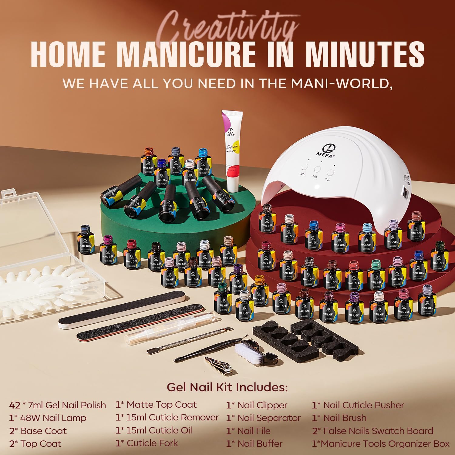 MEFA Gel Nail Polish Kit with U V Light, 42 Colors Fall Winter 60 Pcs Gel Nail Starter Kit with Base Matte Glossy Top Coat, Nail Art Accessories, Nail Tool Box, Cuticle Remover Care Mnicure DIY Salon