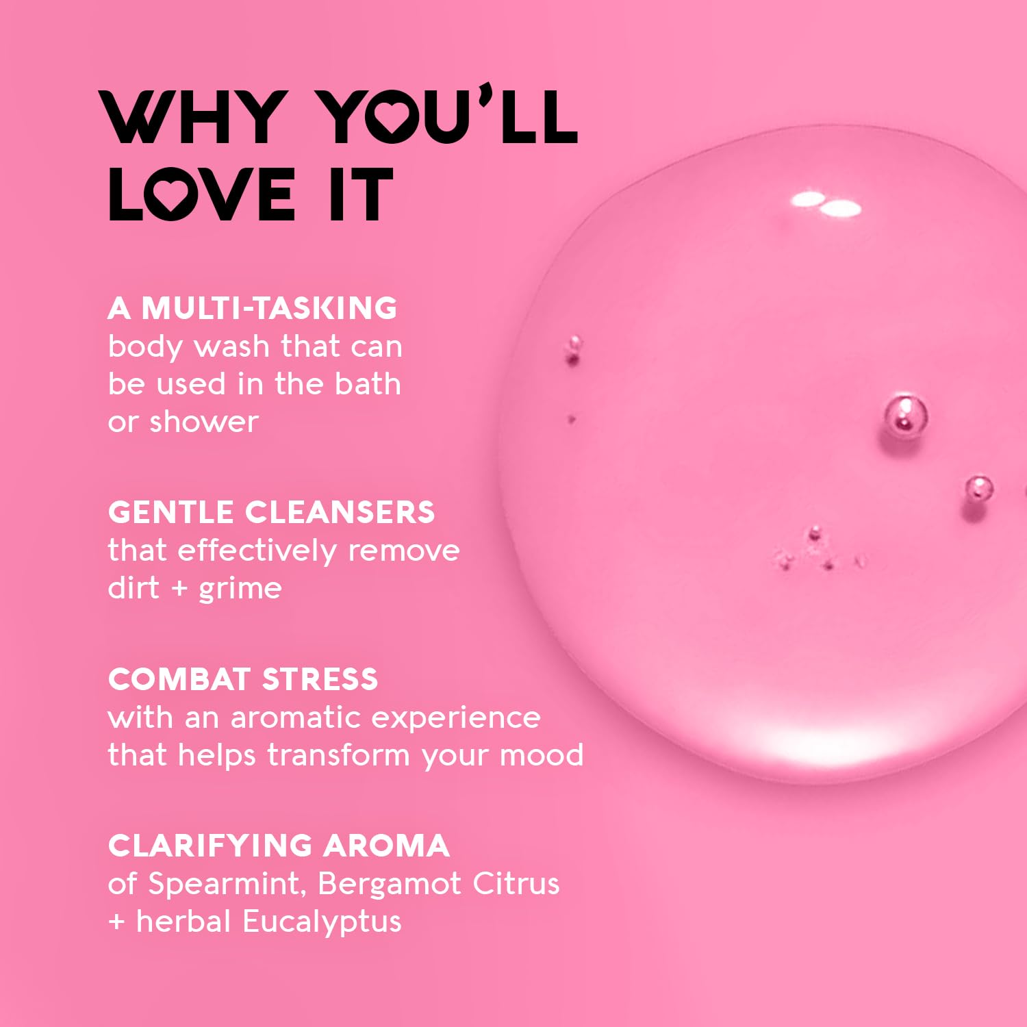 • Clear Your Mind: Breathe in the clarifying aroma of spearmint, bergamot citrus, and herbal eucalyptus; promotes a balanced and calming shower experience