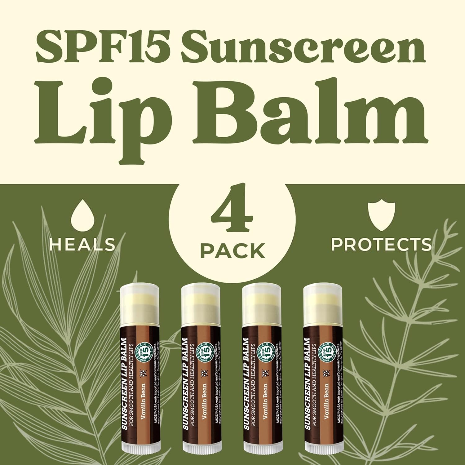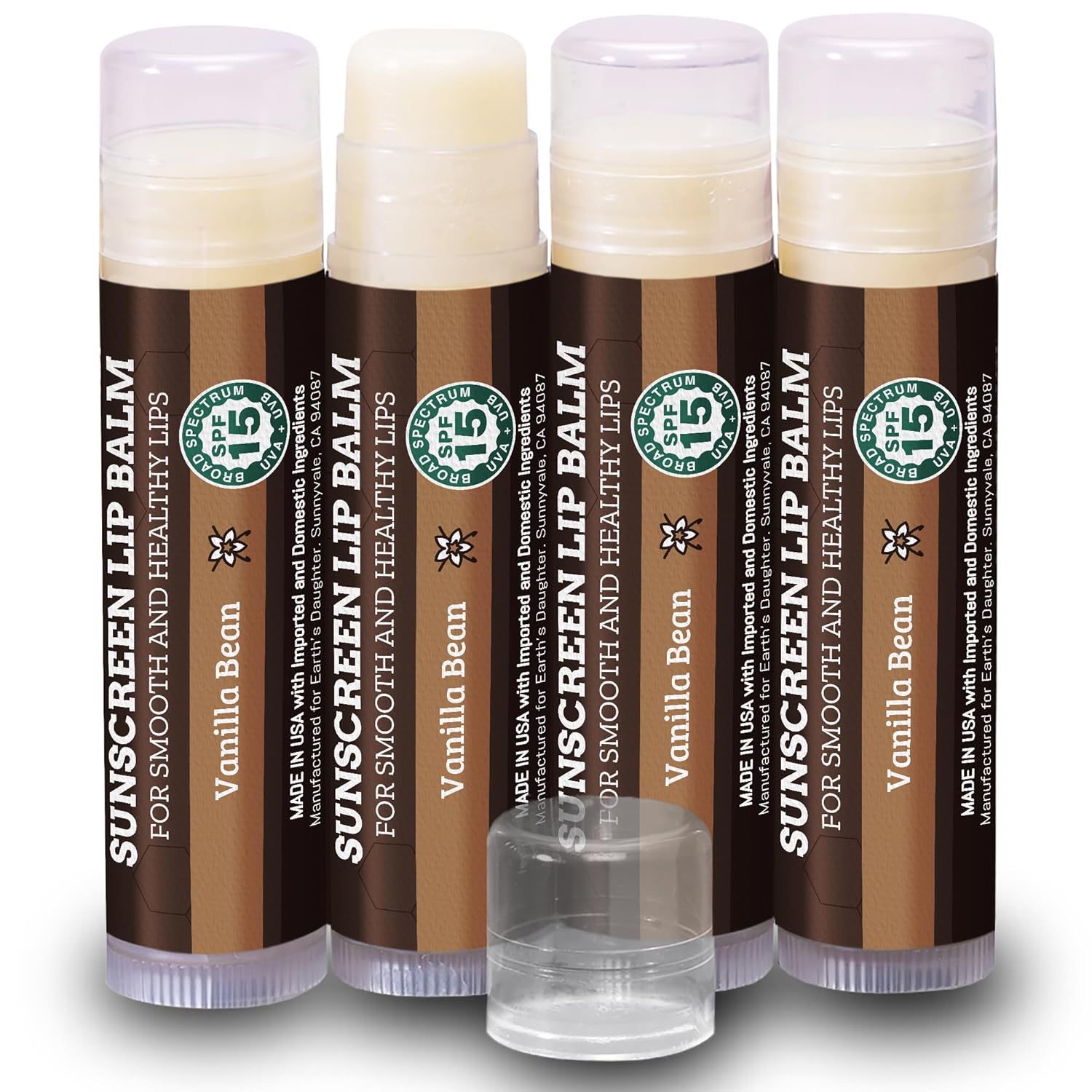 • 4 PACK of SPF 15 SUNSCREEN LIP BALM – Delicious Vanilla Flavor. Everyone loves our vanilla lip balm with SPF 15 sun protection, organic beeswax, organic coconut oil and other premium organic hydrating ingredients to protect and moisturize all day long. Our lip balm is great for everyday protection and safe for the whole family