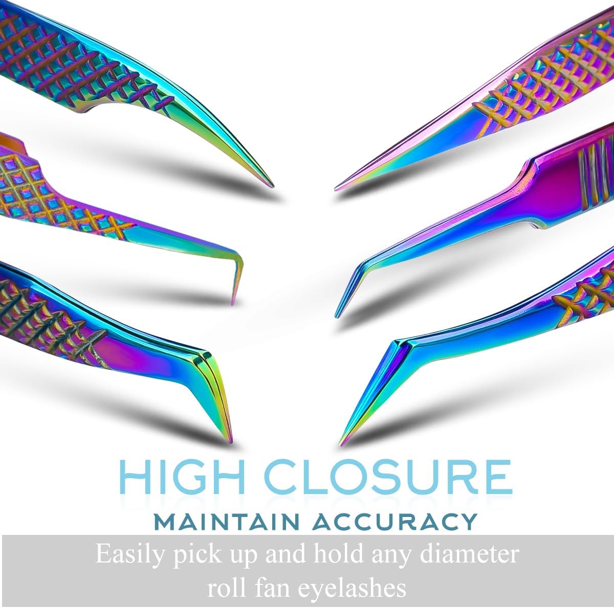 SIVOTE Eyelash Extension Tweezers Fiber Tips Japanese Steel, Set of 6 – Curved, Dolphin, 90° 45° Volume Boot & Slight Curved Tweezer – Professional Lash Tweezers for Lash Extensions Rainbow