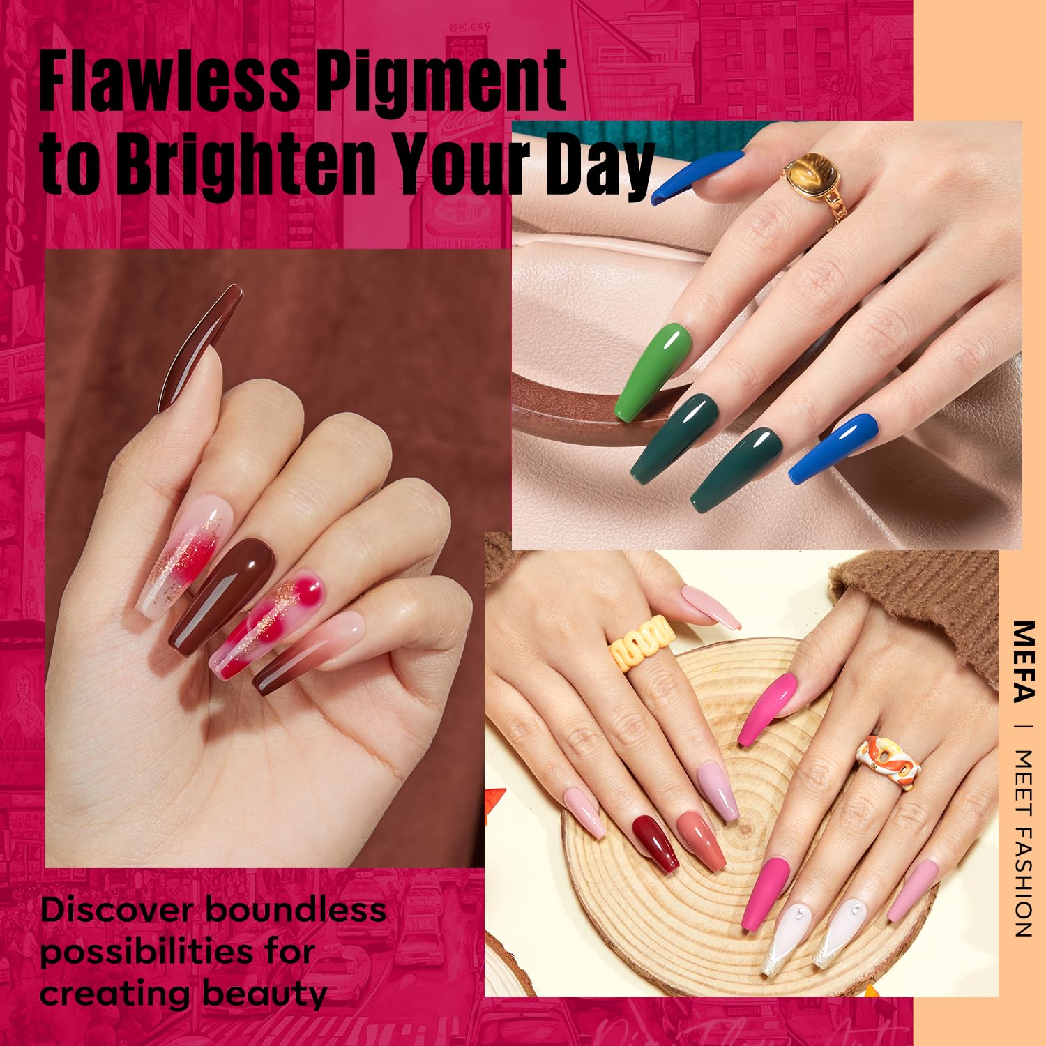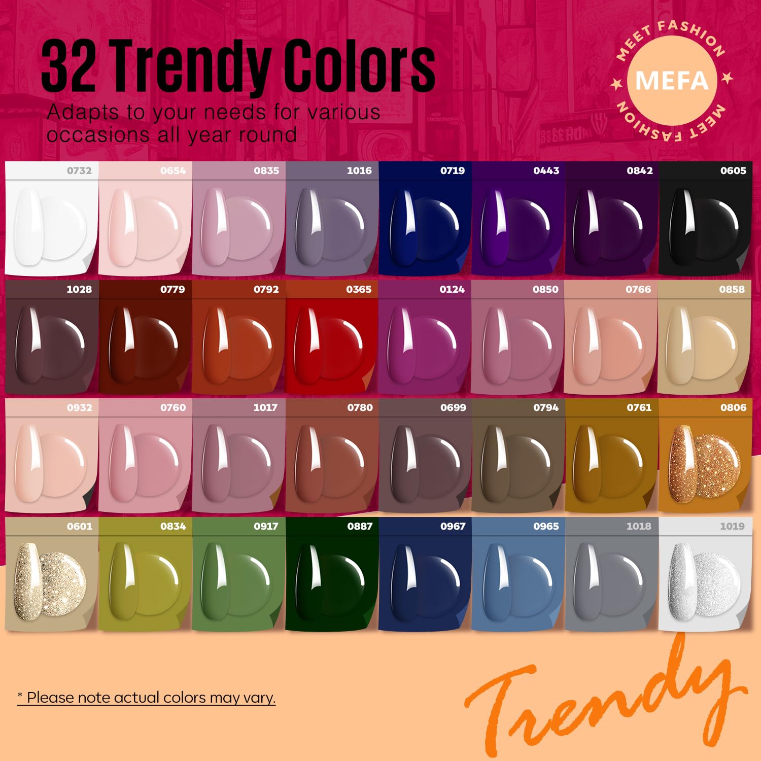 • 32 Colors Gel Polish: MEFA’s fall-winter set features 32 shades (7 ml each), including deep red, burgundy, purple, and champagne gold; perfect for autumn and winter, these trend colors offer looks from cozy purple to elegant nude