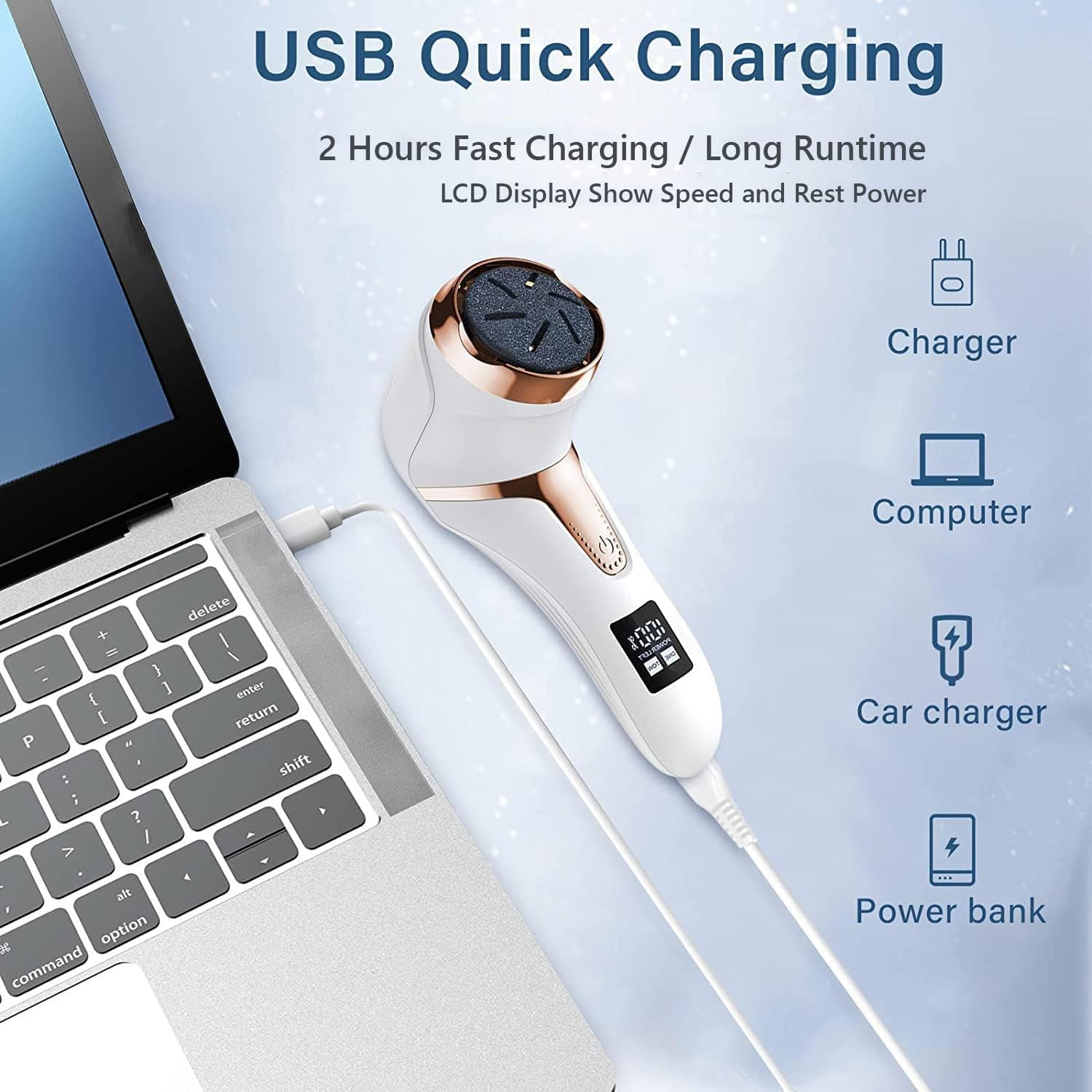 • Rechargeable, Long-Lasting, Easy to Use ----Included USB charging cable, This electric foot file can be charged via any USB port, and have a long runtime 2hours after full charged .and this dead skin remover for feet have LCD Power display let you clear know the rest power it left. remind you charge in time
