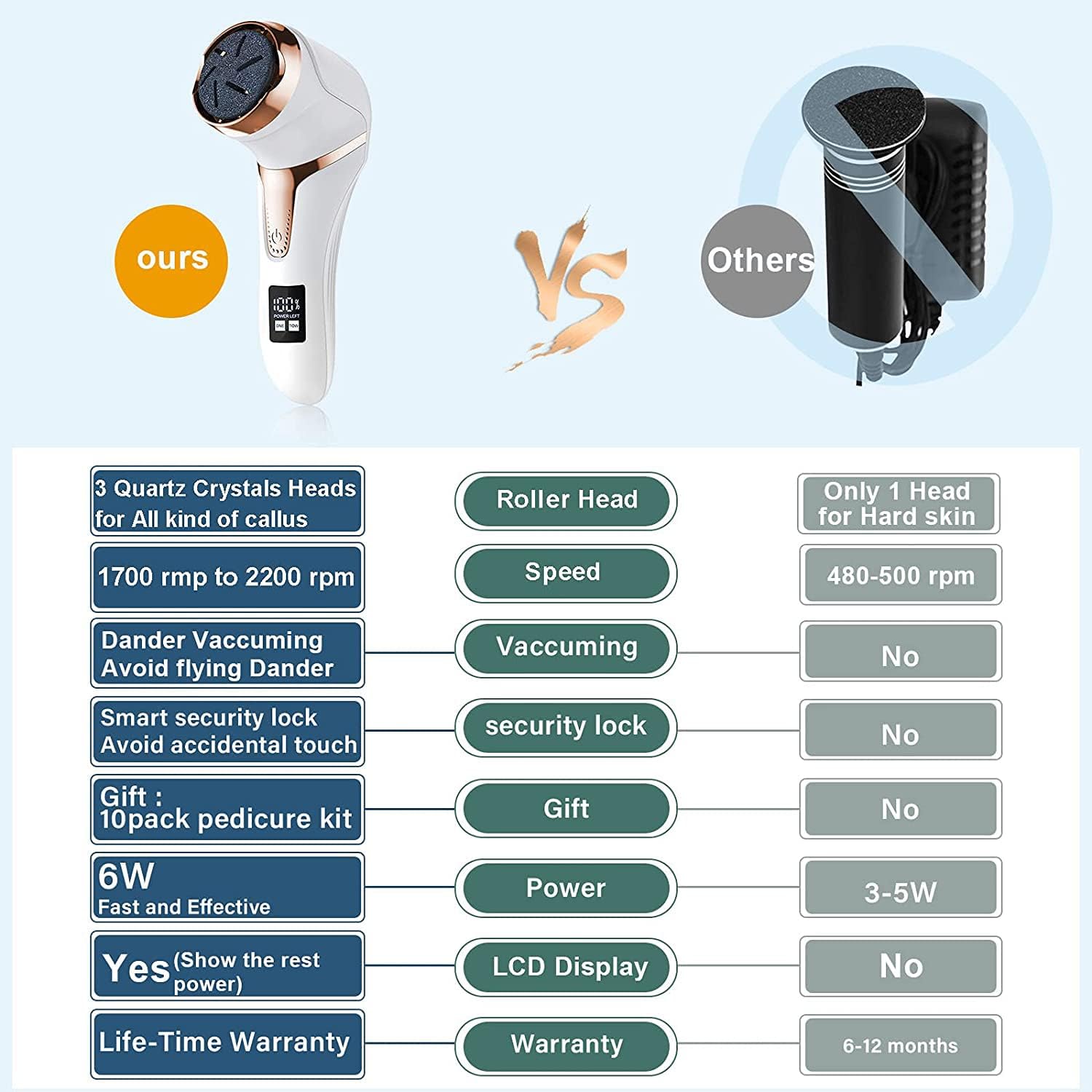 • Pedicure kit with 3 Grinding Head, 2 Speed, with VACUUM ABSORPTION----- 3 Quartz Crystals Removable Roller Heads and 2 Speed Correspond to the roughness required to remove the calluses on the feet. UPGRADE powerful callus remover with dander vacuum cleaner quickly sucks away foot scraps, cle.an and hygienic, and sucks while grinding. dust-free, and foot scraps will not be scattered in air or floor, an essential home pedicure kit for people who has cleanliness.