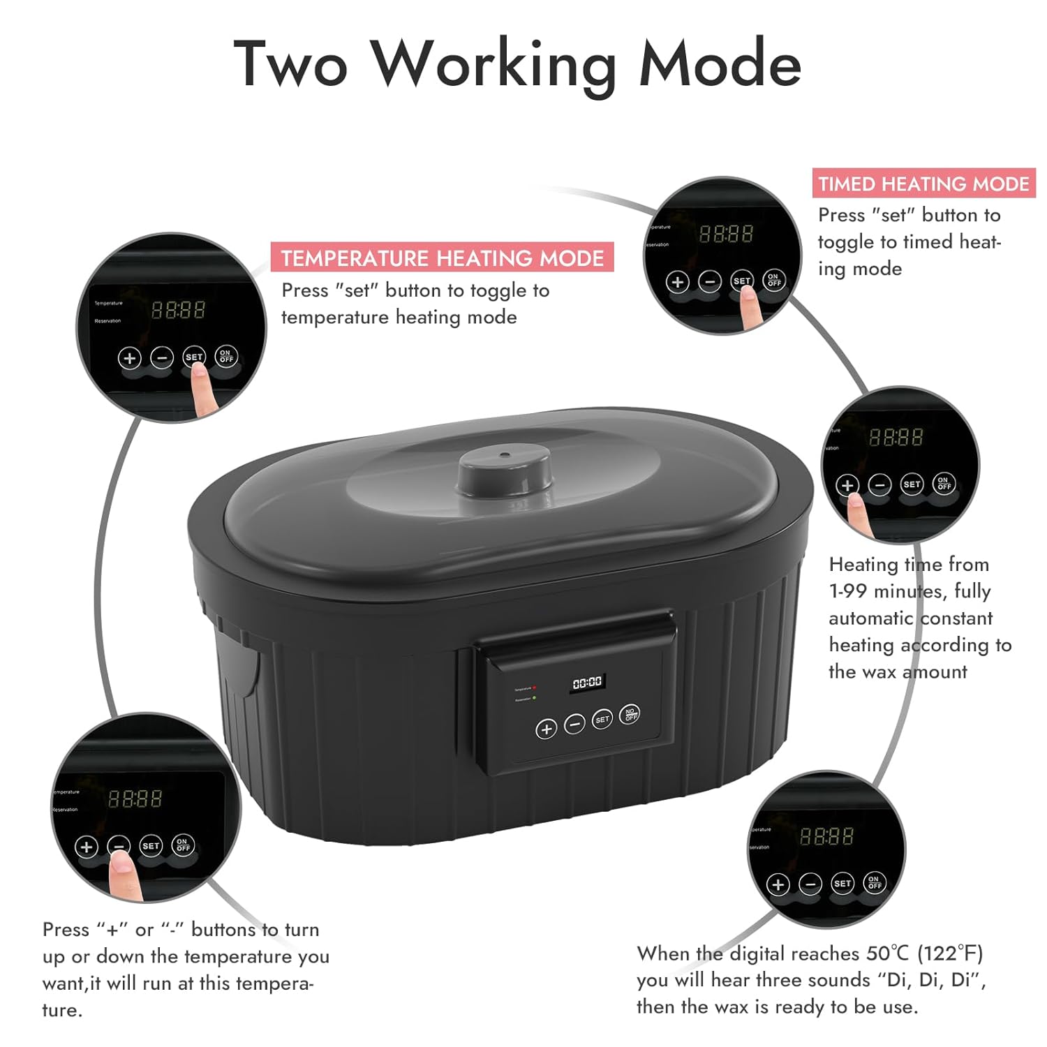 • Easy To Use:Put the paraffin wax into the machine, and then choose the right temperature; Wait a while for the wax to melt the water, dip your hands, elbows or heels into the wax, then relax and enjoy the hot wax spa treatment, peeling off the silky skin. Test: It takes about 50 minutes to completely melt 2 lbs wax at 185°F.