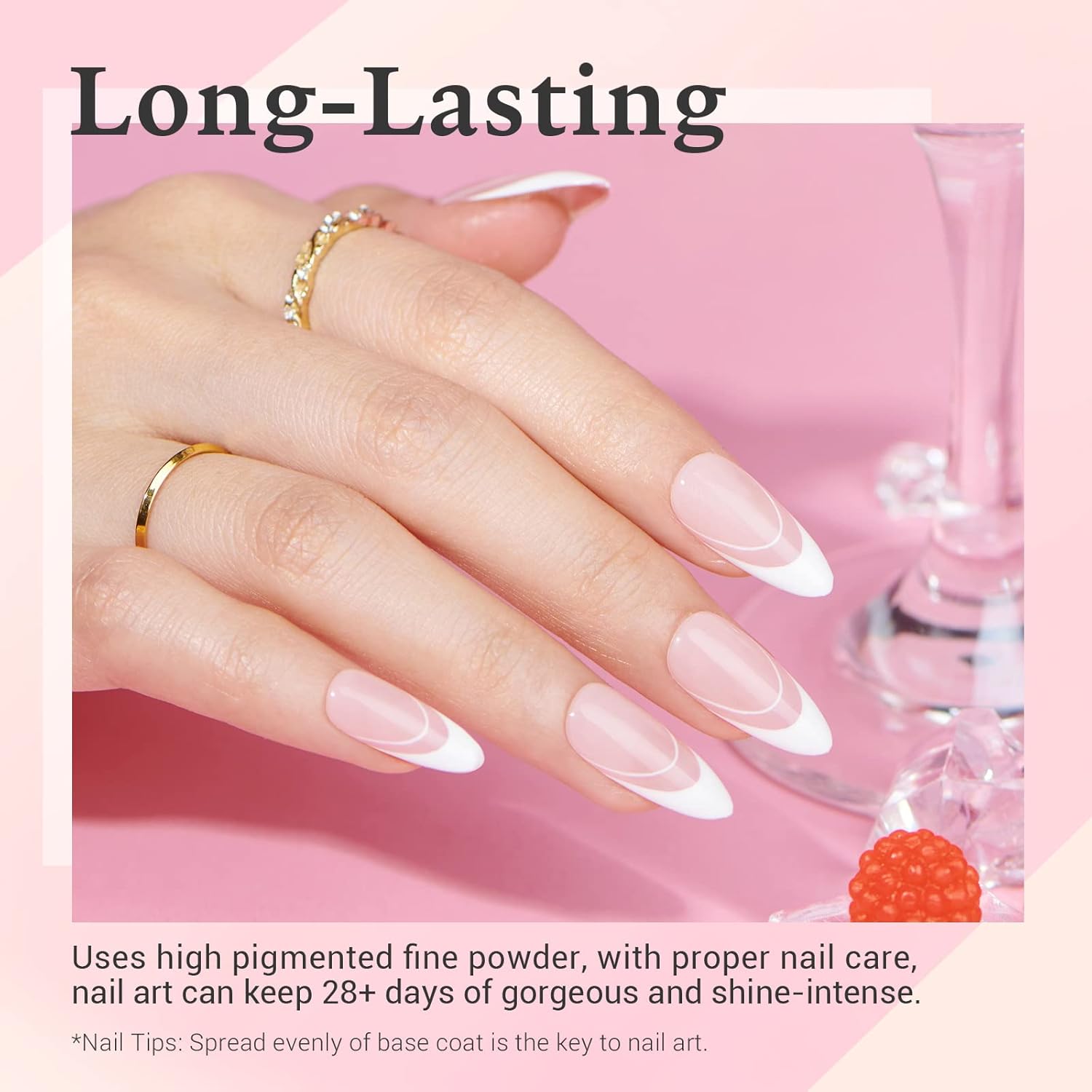 • Attention: ① Avoid direct contact with skin, remove immediately if you feel any discomfort. ②The effection of dip powder may show differently in different people, 2~3 base coats while using will be the best