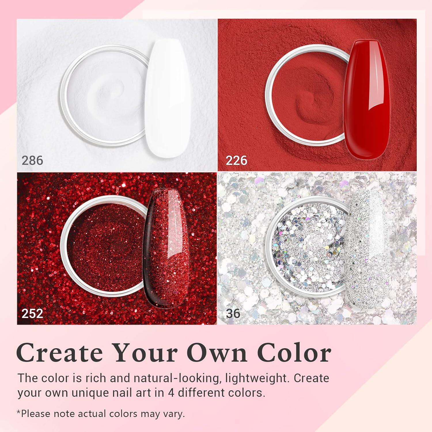 • What U Get: AZUREBEAUTY 12 PCS dignified dip powder nail starter kit—4*10 g color powder(rose apple berry red, sparkle red, snow white, silver glitter), 3*10 ml liquid set(base coat/activator/topcoat), 2*liquid brush replacement, 1*nail brush,1*nail file, 1*dip powder tray