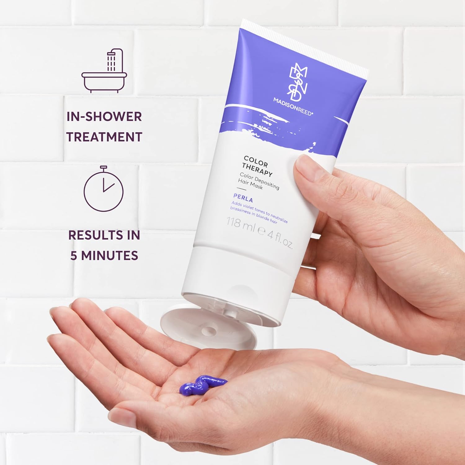 • COLOR DEPOSITING HAIR MASK: Madison Reed Color Therapy in Perla works best on light to dark blondes, as well as brunettes with highlighted hair, and adds violet tones to neutralize brassiness and unwanted yellow tones. Not intended for gray coverage.