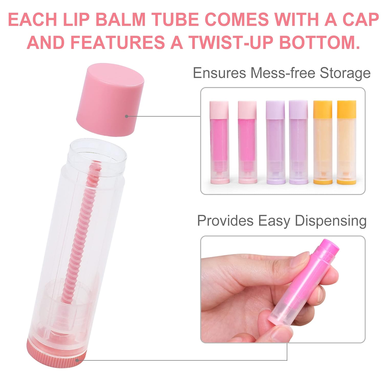 • 【EASY TO USE】Our lip balm containers come with a roll-up mechanism to effortlessly push your lip balm to the top for quick and easy application; Includes 60 pink, snug-fitting, snap-on caps that keep your product safely sealed; These tubes are similar to traditional lip balm tubes and provide a clean and clear look to your products