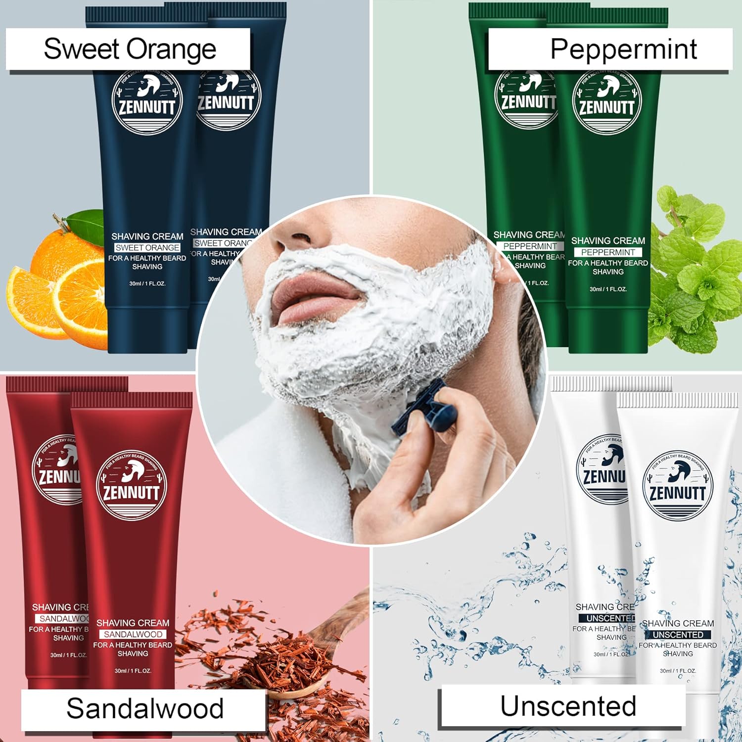 • Shave Beard is No Longer Annoying:After rinsing face,the shaving cream will leave your skin refreshed and soothed and makes for a more comfortable shave.The shaving kit for men includes 4 Scented creams.The light citrus smell is pleasant,the Sandalwood smells manly,the Mint creates a cooling sensation and the unscent one will not be competing with your cologne or other strong perfume.All of them are included in the gift box.Absolutely the tip-top shaving lotions set in your shave kit.