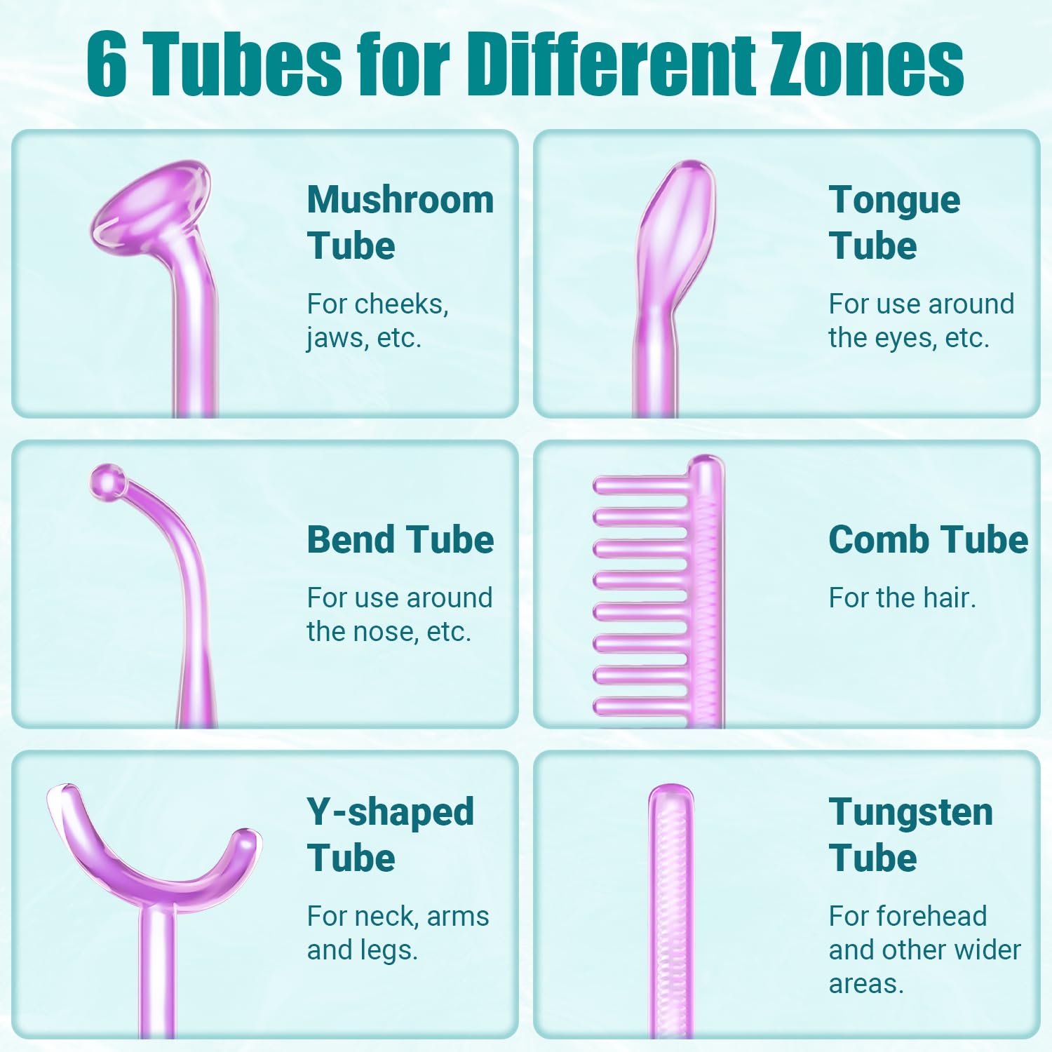 • 6 Different Glass Tubes for Your Needs: This portable high frequency facial machine provides 6 different glass tubes to meet your needs, allowing you to focus on all the different area. 1 Mushroom tube. 1 Tongue tube. 1 Bend tube. 1 Y Shaped tube. 1 Tungsten tube. 1 Tube