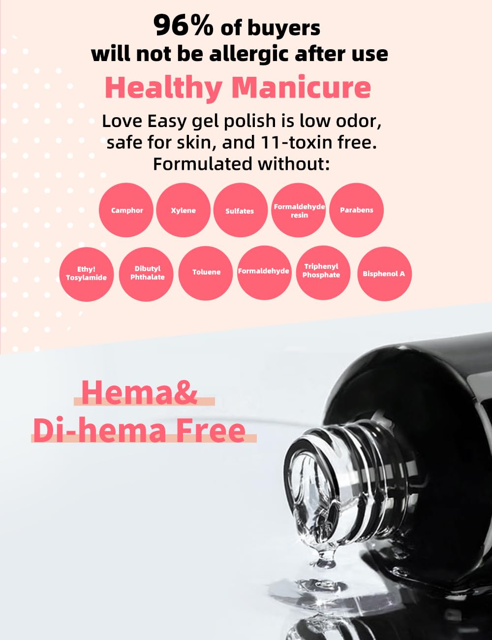 • Tips for preventing nail surface peeling off: (1) Polishing of the nail surface: Polish the front, side and trailing edge of the nail until there are no reflective spots on the nail surface. (2) Nail surface cleaning: It is recommended to use Nail dehydrator to remove oil and moisture from the nail surface. (3) UV/LED lamp time: It is recommended that the lighting time for base Coat, Color Gel and Top Coat 60-120 seconds.