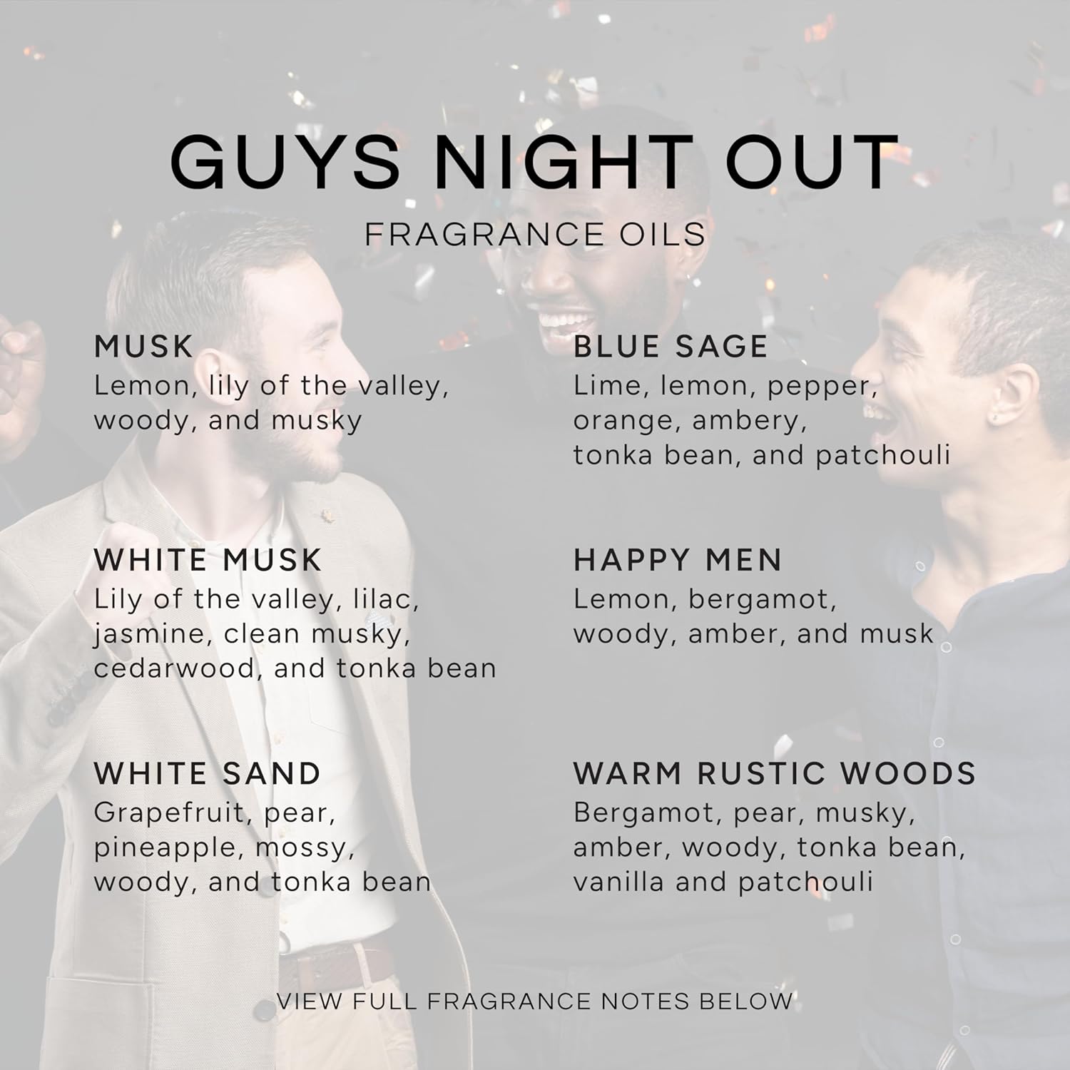 • GUY'S NIGHT OUT SCENTED OILS: Light, refreshing floral and musk smelling scents formulated for making candles, soaps, air freshener sprays, aromatherapy diffusers, dryer sheets and cleaning products. These seasonal essential scents make the perfect gift for the whole family!