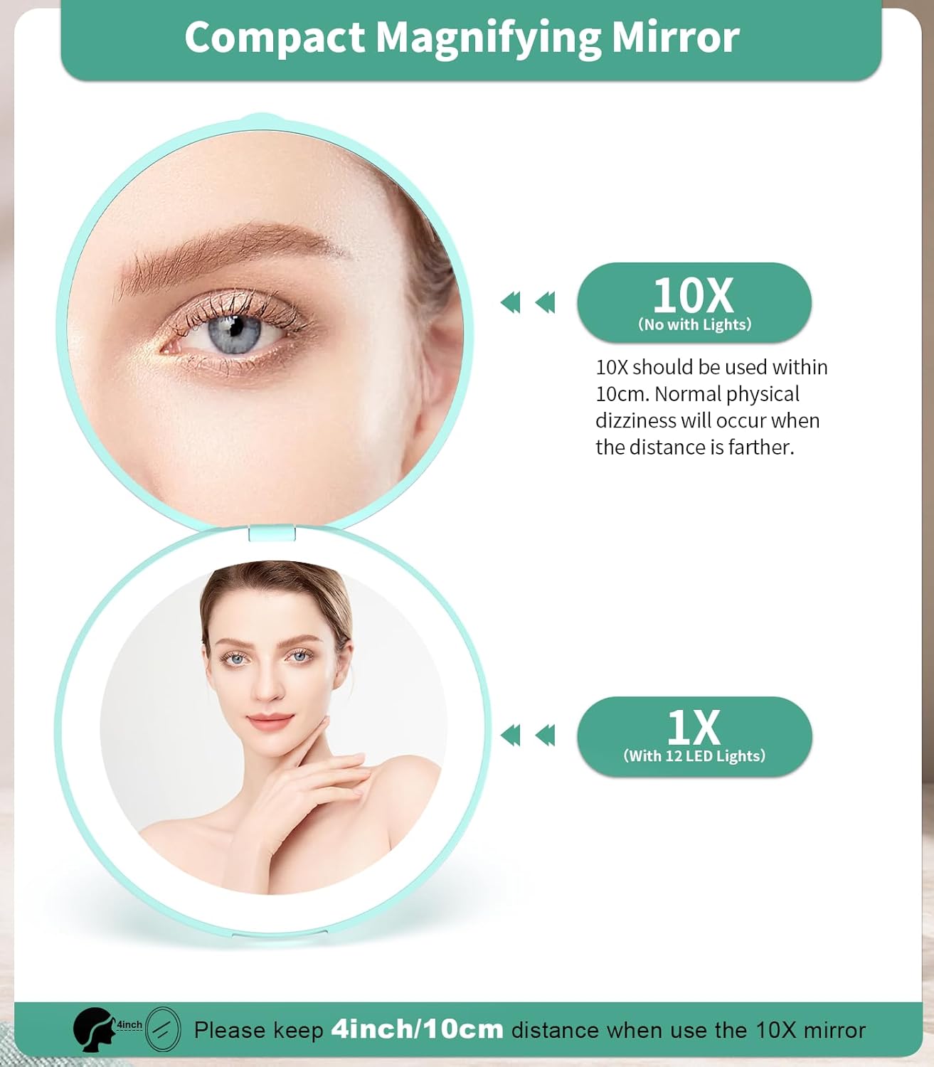 WOBSION Travel Compact Mirror,Portable 1x/10x LED Makeup Mirror with Magnification,Handheld 2-Sided Pocket Mirror, 3.5in Small Mirror for Purse,Handbag,Gift,Cyan&Pink,2 Pack