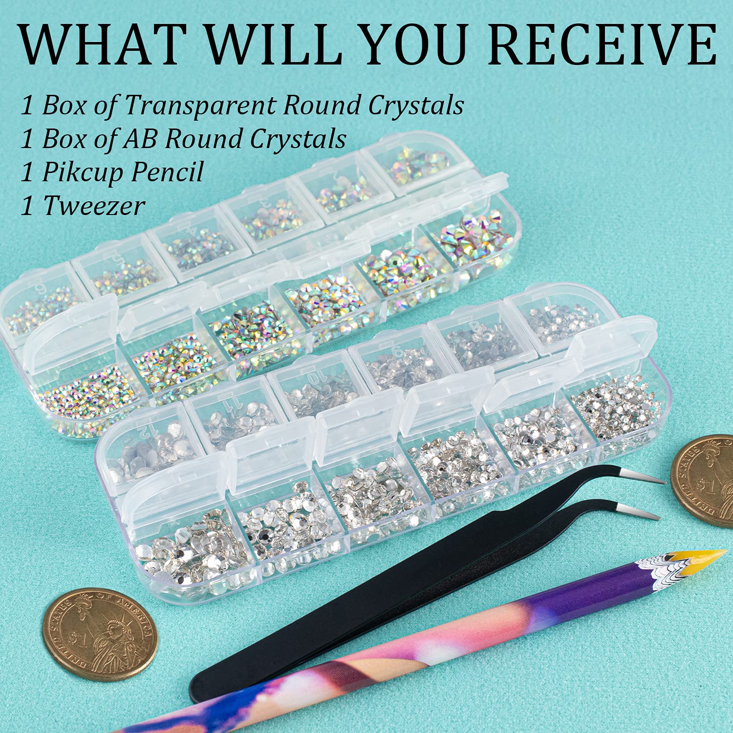 • ❤WHAT YOU WILL RECEIVE -- 1 Box of 6 Sizes Transparent White Round Glass Nail Crystal Rhinestones Beads (Totally About 1720 PCS); 1 Box of 6 Sizes AB Round Glass Nail Crystal Rhinestones Beads (Totally About 1720 PCS); 1 PCS Rhinestone Picker Pencil; 1 PCS Tweezer. The Well Equipped Rhinestone Set Is Suitable for Both Professional Nail Technician and Inexperienced Starter for Nail Art.