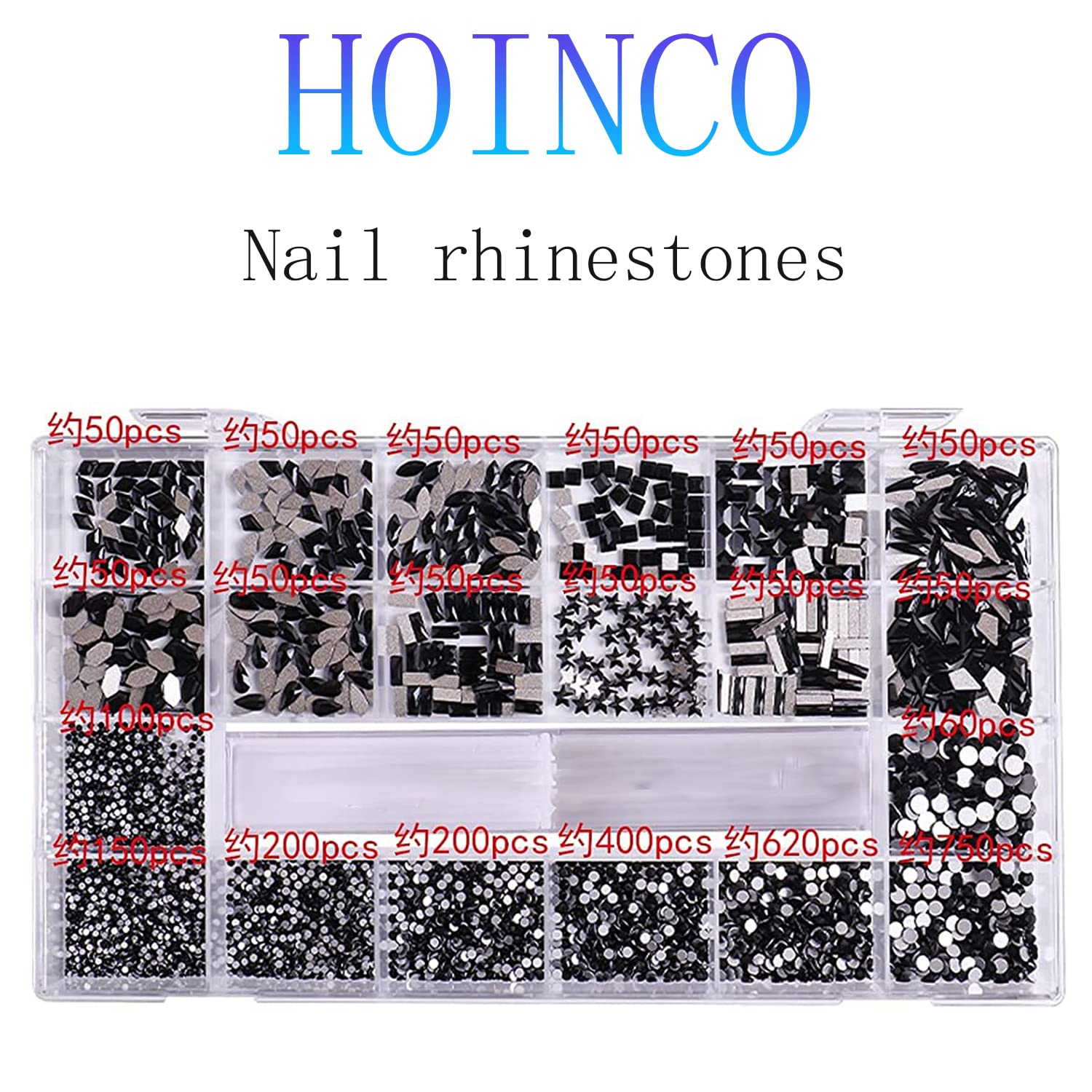 3100Pcs Flat Back Rhinestones for Nails, HOINCO Black Rhinestones for Nails, Mix 20 Styles Flatback Rhinestone/Gems, 600 Diamonds + 2500 Round Rhinestones Beads for Nail Crafts with Tweezers Pen