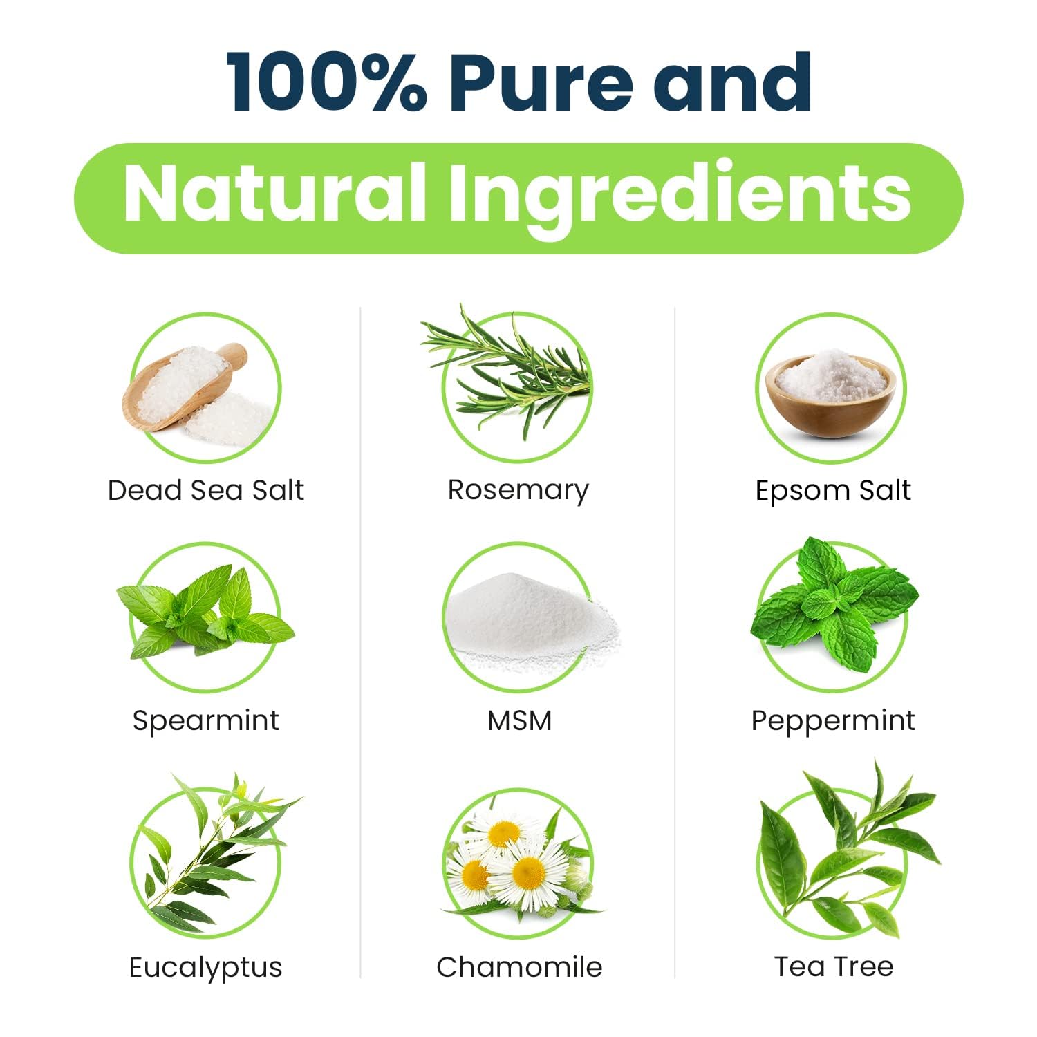 • 100% NATURAL TEA TREE FOOT SOAK FOR HEALTHY FEET: Using nothing but the finest natural and organic ingredients, this foot soak is rich in Epsom salts, Pure DeadSea salts, tea tree oil, eucalyptus, peppermint, cajuput, camphor, rosemary, lavender, and other essential oils. Their powerful combined action is the perfect way to fight away foot conditions, soften your calluses, moisturize your cracked heels and pamper your tired and sore feet whenever you feel like it!