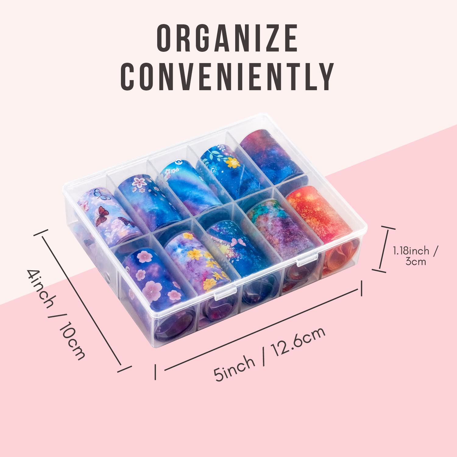 • PACKAGE INCLUDES: A box of 10 rolls of nail foil transfer stickers. Nail art Sticker size: 39.4inch x 1.57inch (100x4cm)