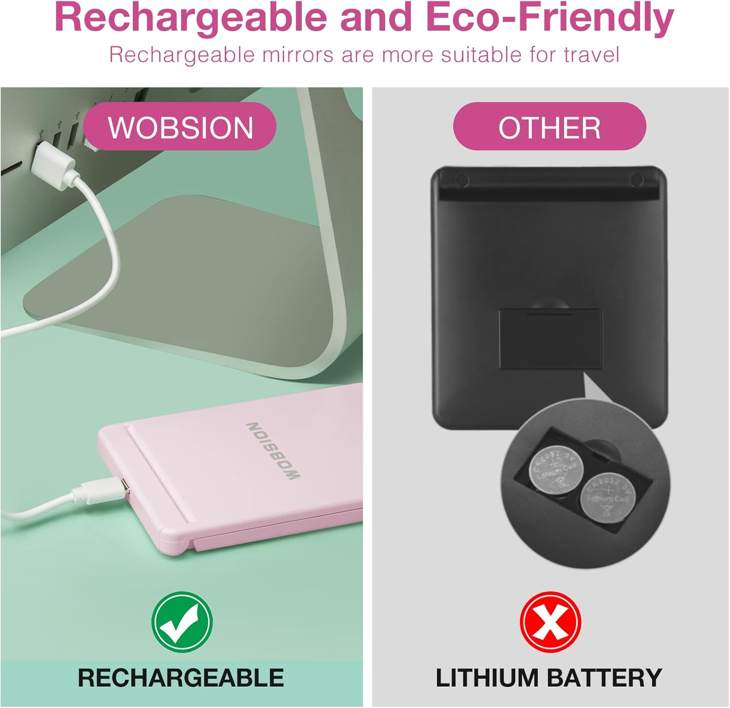 • Rechargeable Travel Makeup Mirror:No need batteries,long lasting,one charge can last for 4-5 hours,only takes 1-2 hours to fully charge