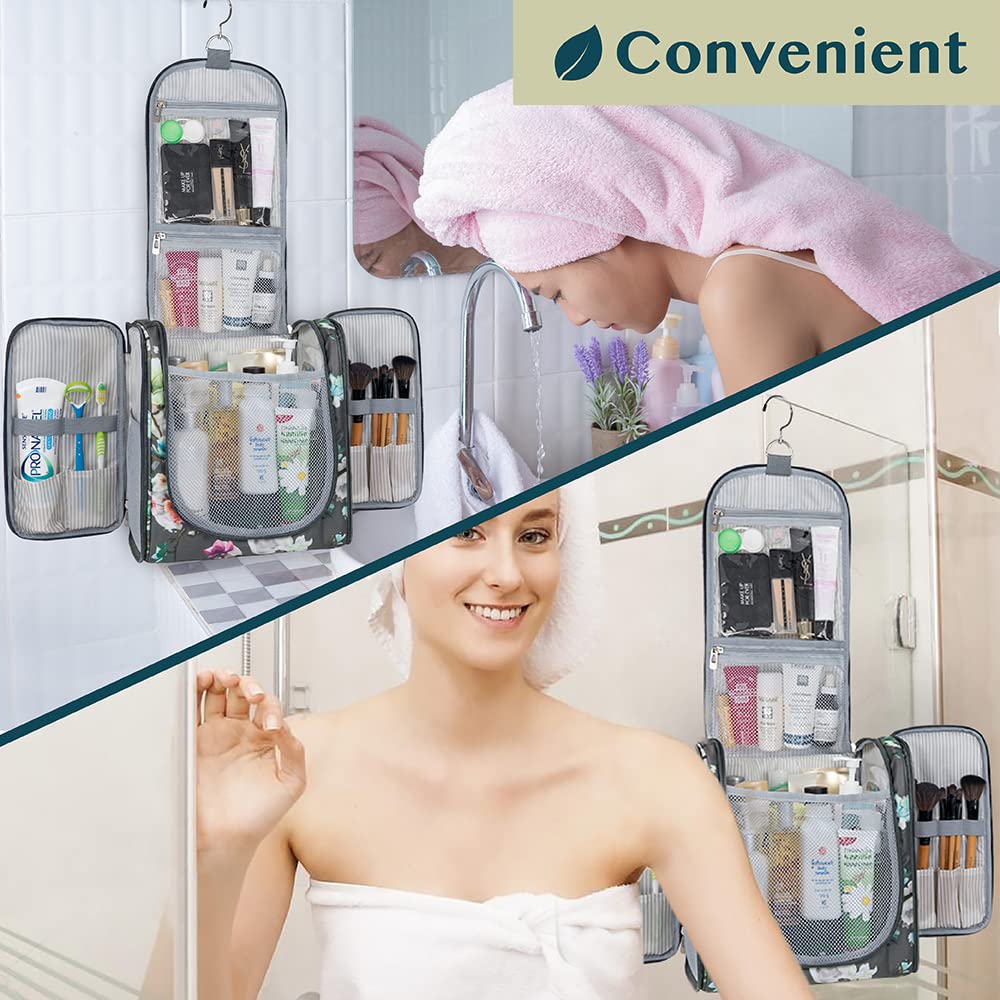 PAVILIA Extra Large Toiletry Bag Travel Bag for Women Men, Hanging Cosmetic Organizer, Water Resistant Makeup Bag for Accessories Toiletries, Travel Essentials Kit (Floral Grey)