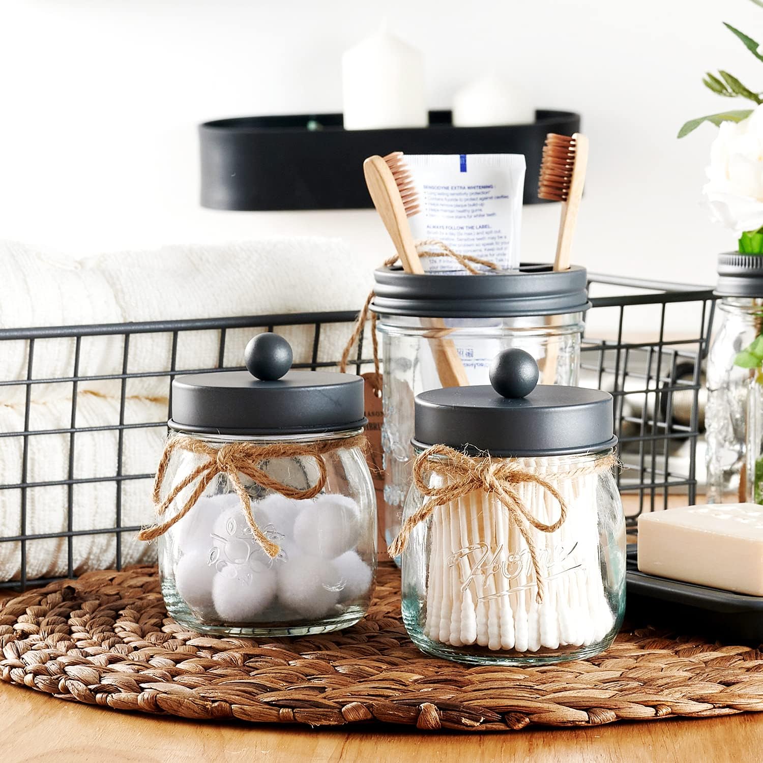• ✔️Easy to Open and Close: This bathroom set includes two 8-ounce glass mason jars with standard-size metal lids. Perfect for any bathroom and they are small enough to fit neatly and keep by the sink and not get in the way or make the counter look cluttered. These lids provide a secure fit, an easy-open design, and rust-resistant properties. Please note: the lids are designed for a lift-off mechanism rather than a screw-on closure. It makes it so much easier to lift off the top and reach in for a cotton ball or cotton swab.