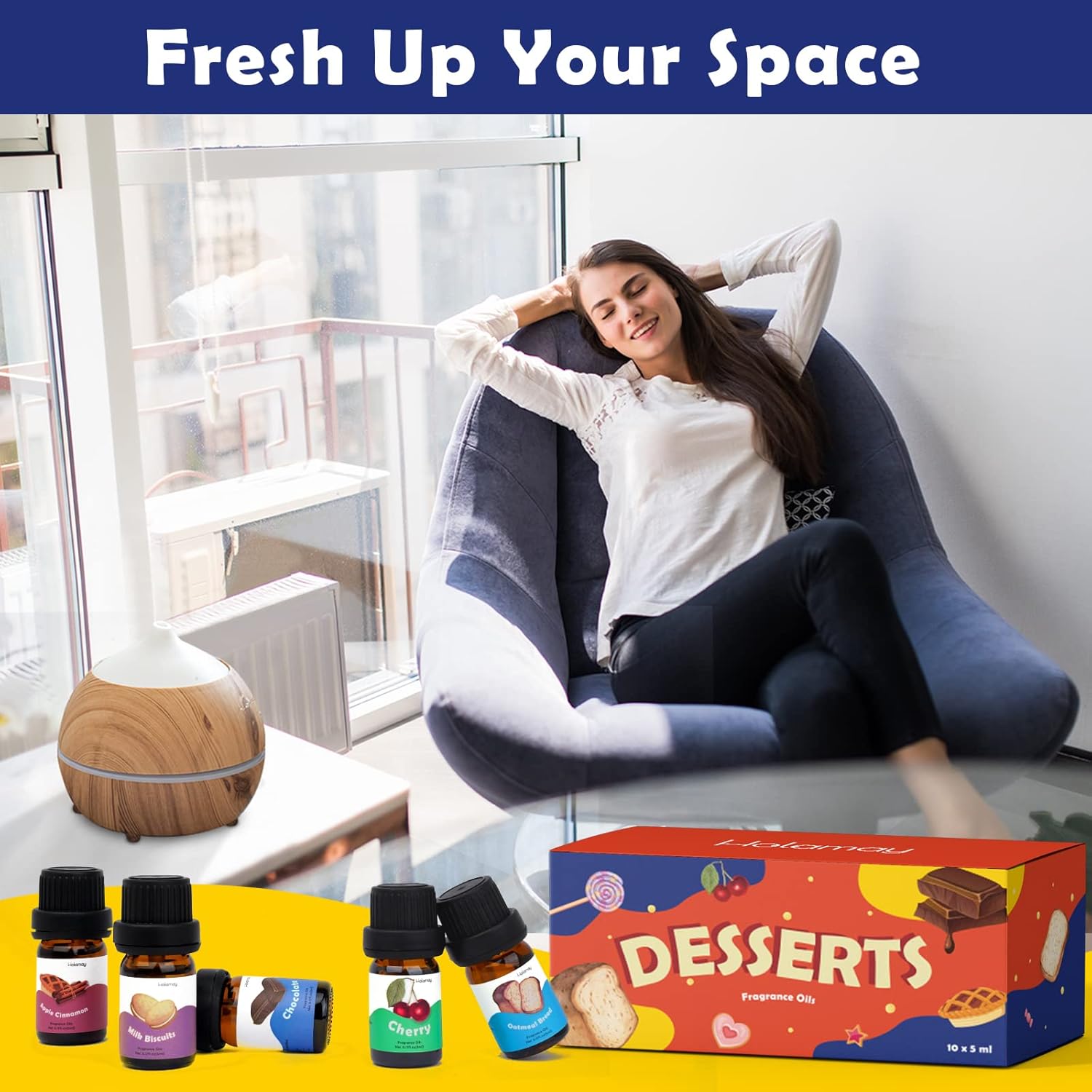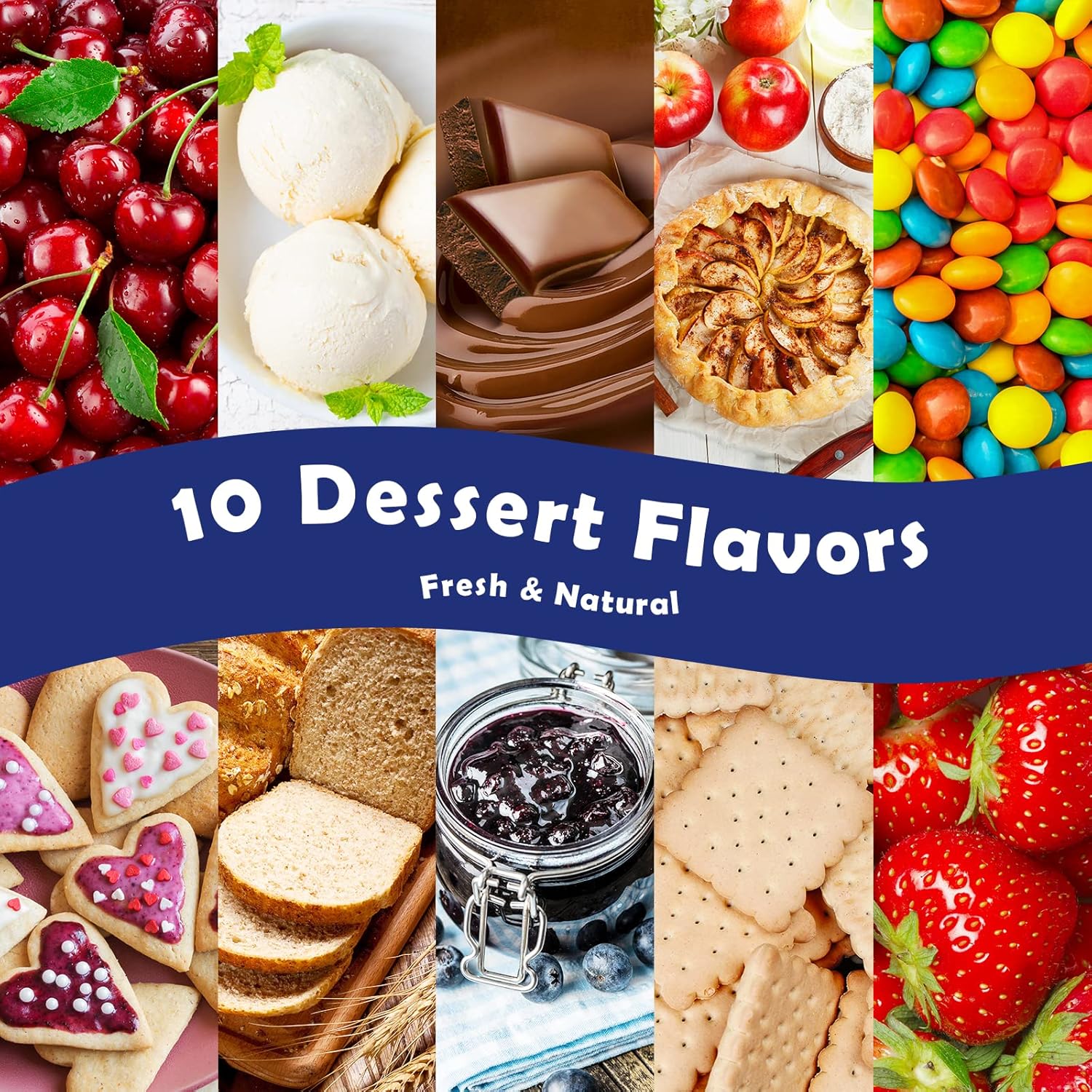 • Delicious 10 Dessert Fragrance Oils (5ML Pack); Each our scented oils bursts a warm and yummy fragrance of homemade desserts - creamy vanilla, apple cinnamon, strawberry, sugar cookies, rainbow candy, chocolate, cherry, blueberry sauce, milk biscuits, oatmeal bread, smell like everything delicious from kitchen